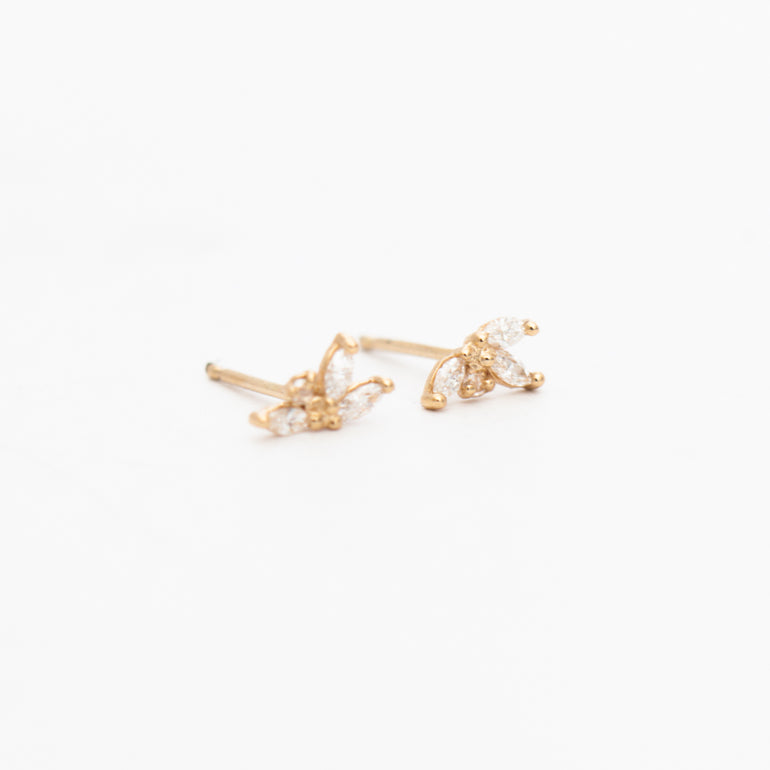 The small scale and delicate setting on these gold earrings float on the ear for a breathlessly light and airy look. Carefully carved by hand with subtle asymmetry, each stud is set with a fluttering trio of marquise diamonds punctuated with one shimmering rose-cut ound. Twist them to create new angles and dazzling arrangements every day. Made in Canada.