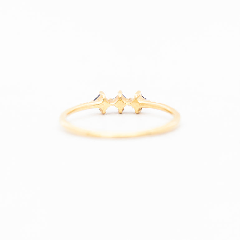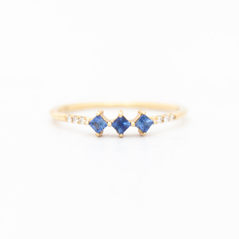 14 karat yellow gold set with three 2 mm princess-cut blue sapphires and six 1 mm white brilliant-cut diamonds.