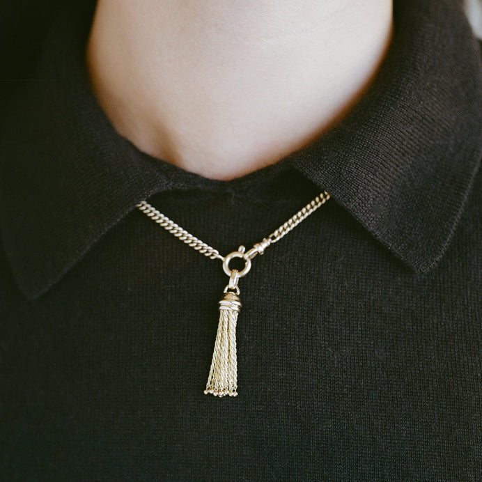 Introducing the Tassel Charm, the latest addition to J.Hannah's collection of chain adornments. Primarily used as a decorative ornament for furniture and garments, the tassel has also been used historically as a protective amulet and a marker of status and accomplishment. J.Hannah's was designed with this multitude of meanings in mind. Styled on the Infinity Chain Necklace.