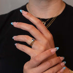 A striking blue sapphire shield ring featuring a luminous 0.91 carat center stone set within a distinctive bubbly bezel that catches light from every angle. Flanked by two star-set white diamonds on either side, this design balances bold color with refined sparkle. The shield silhouette offers a modern take on classic elegance, making it an ideal choice for those seeking a statement piece with sophisticated craftsmanship and timeless appeal.
