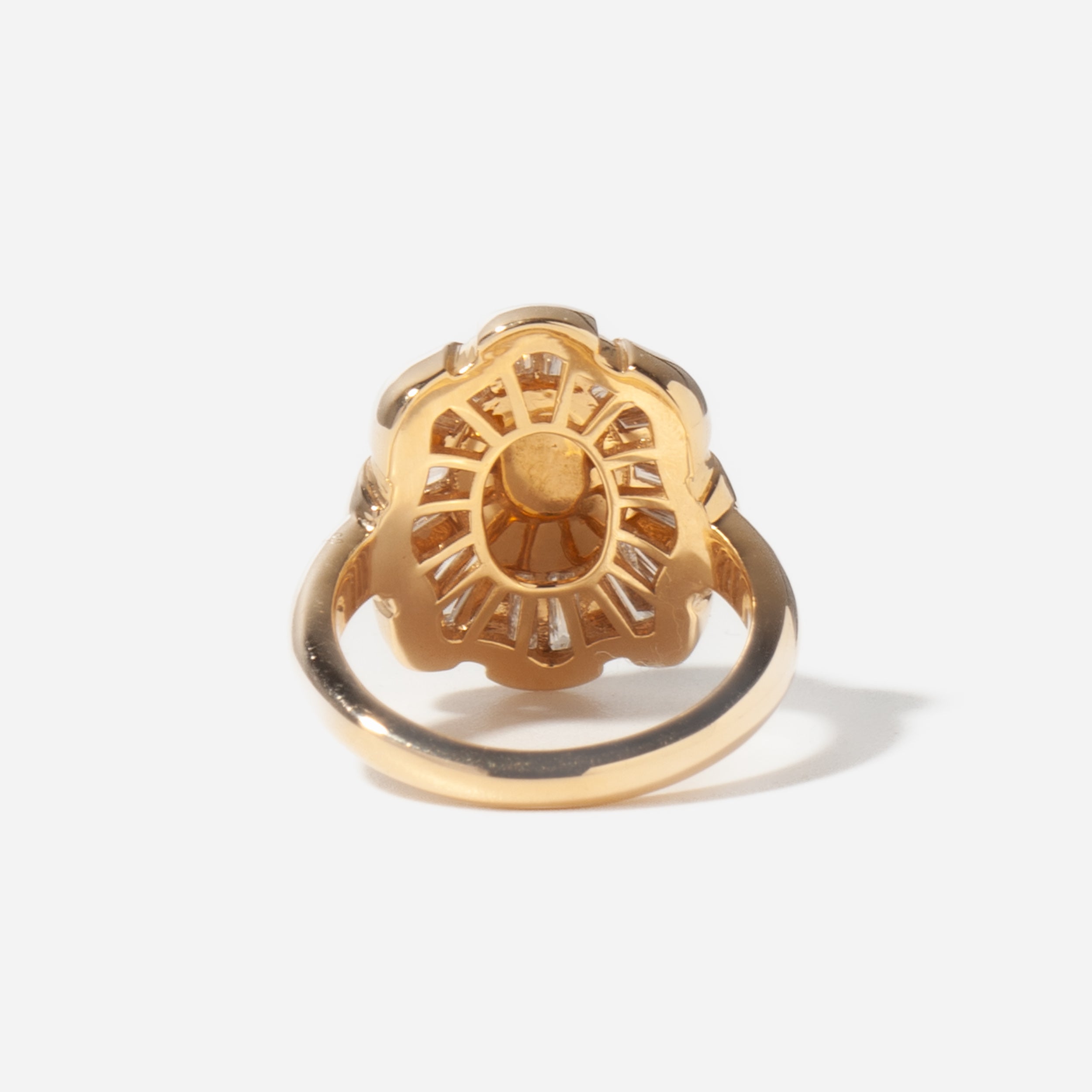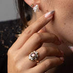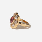 This ring belongs to Electric Dreams, the newest chapter of Sorellina's acclaimed Playlist collection. Inspired by the iconic essence of Jimi Hendrix, this fine jewelry piece embodies the vibrant energy, delicate allure, and limitless creativity that characterized a groundbreaking musical era. Expertly handcrafted, it features a pink tourmaline and diamonds arranged in a floral design with a finely detailed gold bezel.