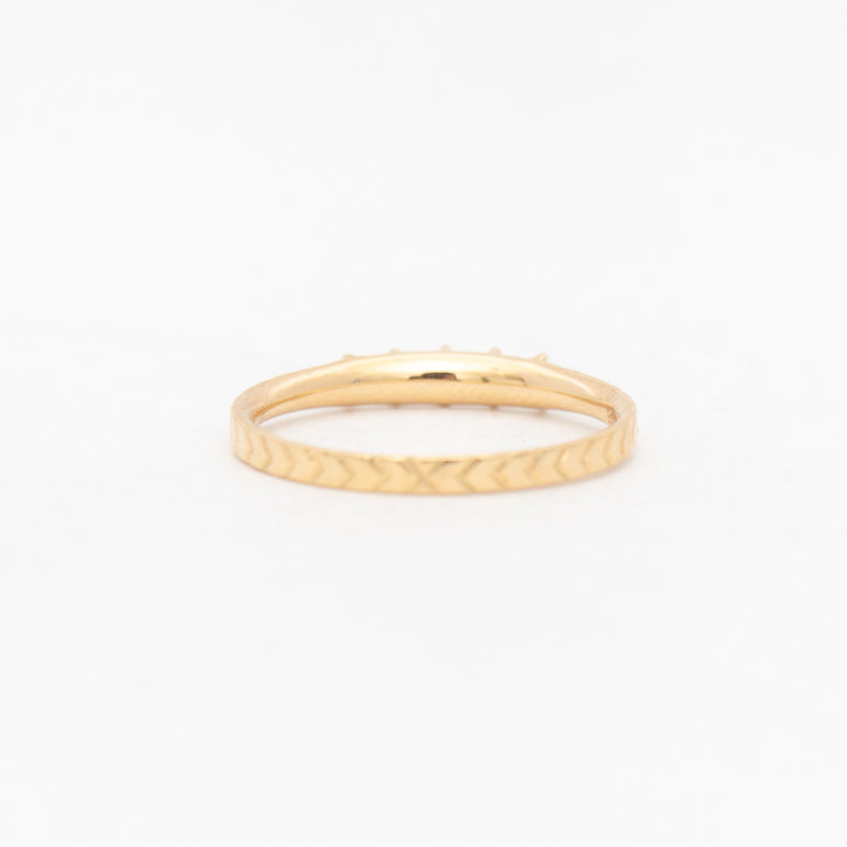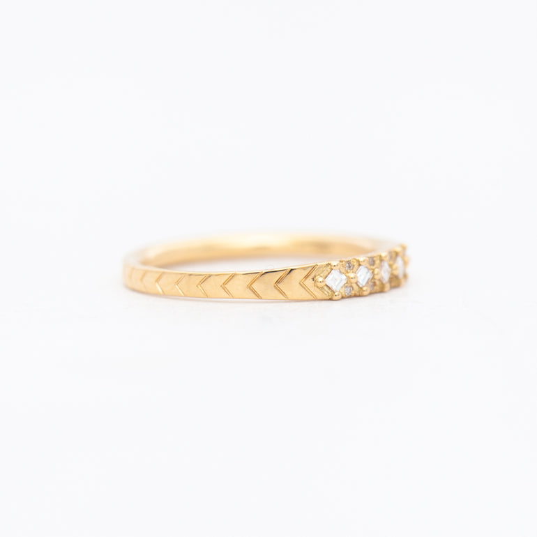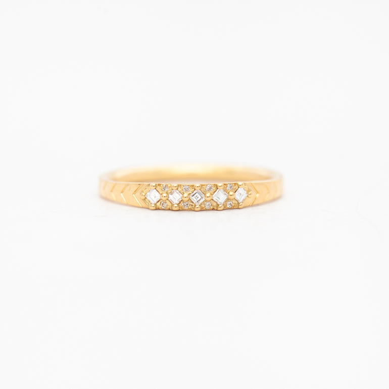 Whether on a canvas of gold, diamonds, or both, the geometric genius of Tel Aviv-based Artemer never fails to shine. In this beautifully textured and tapered band, an engraved chevron pattern flows around the curve of the ring, centered by a row of carré-cut diamonds set on their axes. A dusting of tiny white diamonds adds a finishing touch of glamour. Perfect when worn alone, or as a textural addition to any ring stack. Made in Israel.