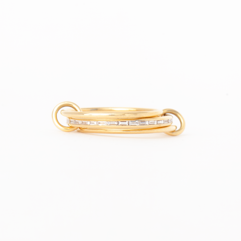 The fan favorite linked ring from Spinelli Kilcollin just got a delicate twist. With a smaller profile than usual, this piece is the perfect ring for those who love a simpler style. Slender baguette diamonds line the center band to add texture and sparkle. Designed for wear as a stunning stack or as a linked series of graceful rings, you'll love finding a way to style it and make it your own. Made in the U.S.A.