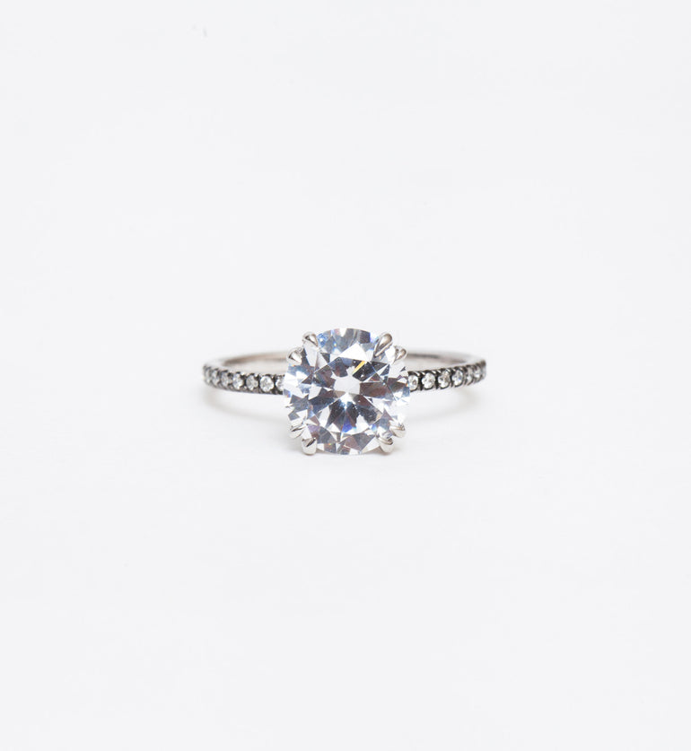A classic as envisioned by Anna Sheffield, this solitaire ring with pavé seems simple enough; yet every little detail has been reworked for a distinct flair. Double prongs with tapered tips nod to antique style settings while a smokey plating of black rhodium under the white diamond band adds edgy contrast. Past, present, and your future—all in one unforgettable ring. Designed in New York.
