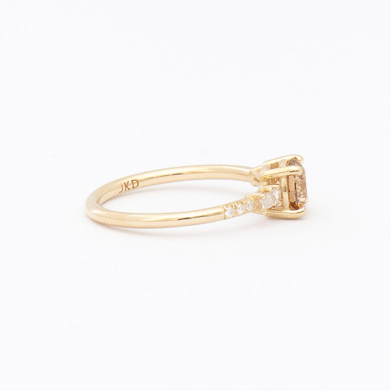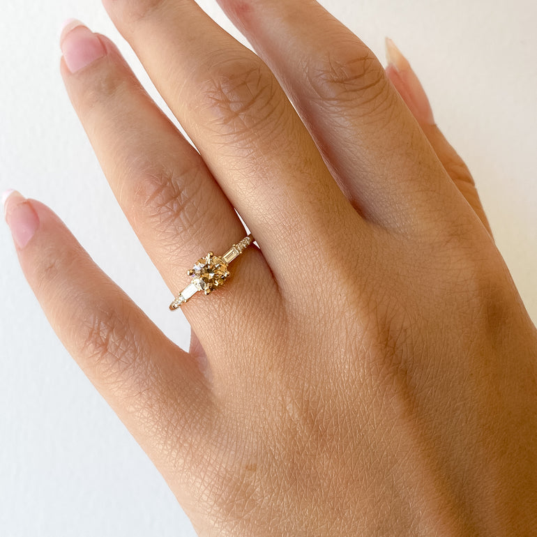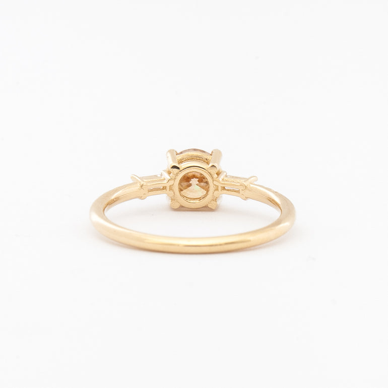 14 karat gold with a 0.75 carat champagne round diamond, two white baguette diamonds, and six 1 mm white round diamonds.