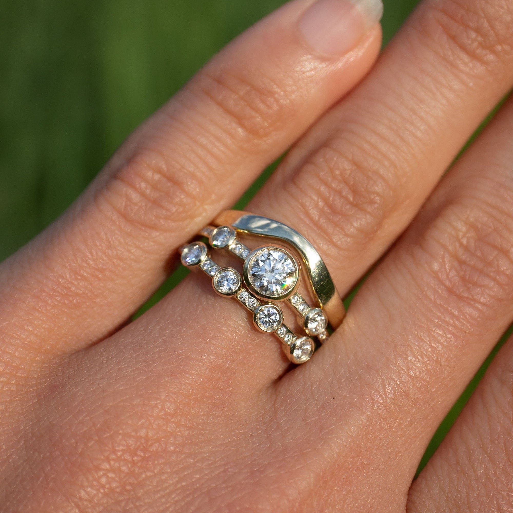 From designer M.Hisae comes a perfectly weighty curved band that softly swoops and hugs your stack and stands just as well alone. Cast from 100% certified recycled gold, this ring sparkles as much from within as it does from end-to-end. Made in the U.S.A.