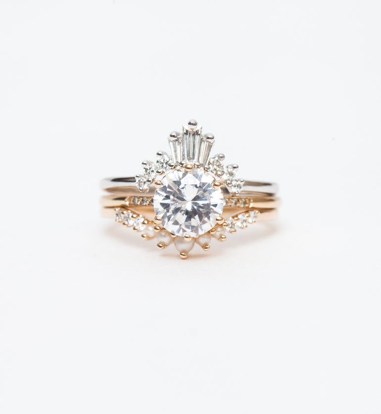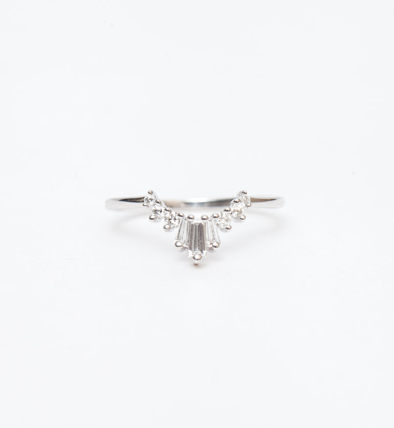 The Art Deco era has long inspired Anna Sheffield, so it was natural for her to infuse the period's iconic architecture into her signature stacking band. A trio of tapered baguette diamonds ascend like New York's famous skyscrapers, adding drama and geometry to any ring stack. For a simpler statement, wear it solo with your solitaire for an unmistakable combination. Designed in New York.