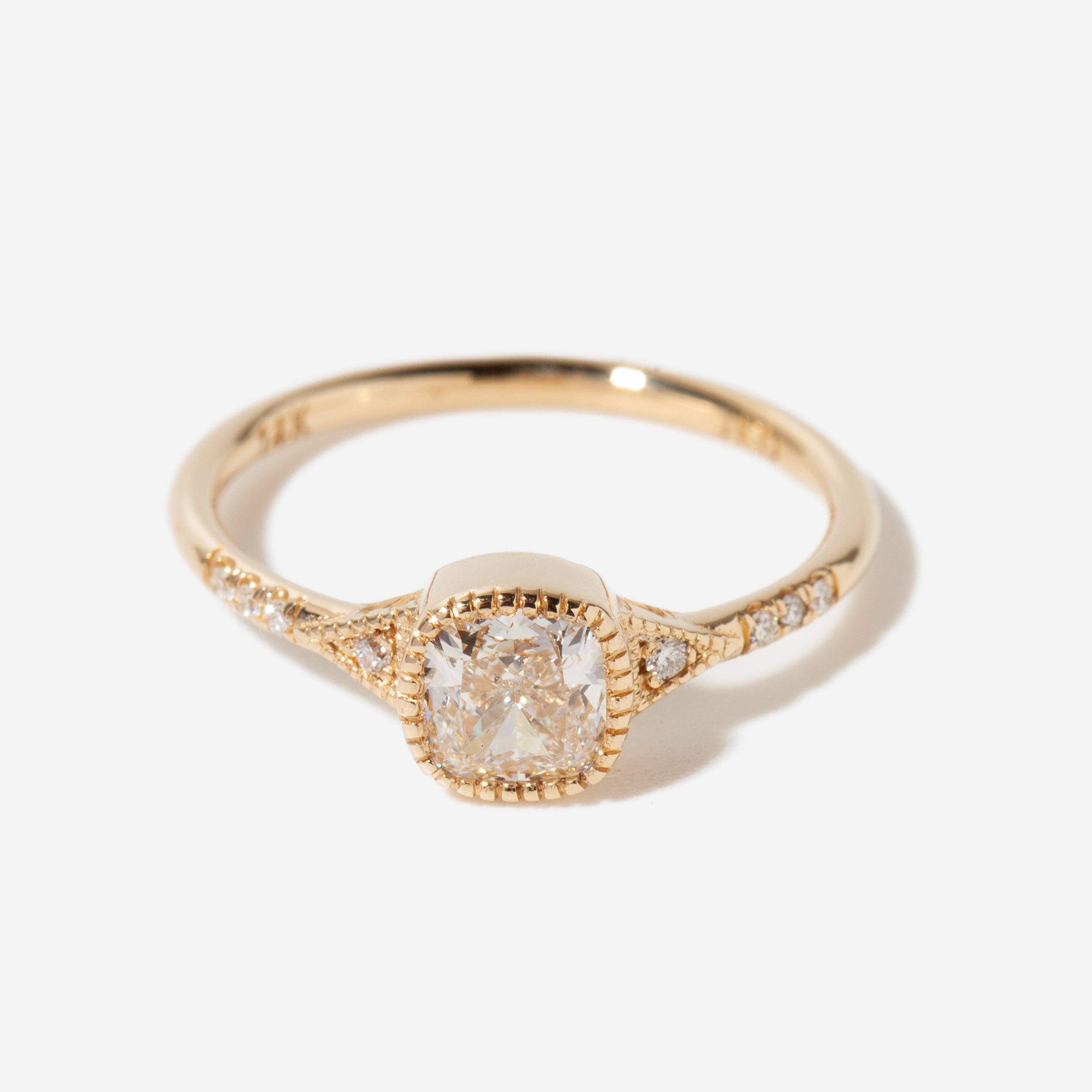 Elegant and captivating, this symmetrical ring showcases diamonds that shimmer like fireworks on your hand. Featuring a bezel-set cushion-cut white diamond framed by Jennie Kwon's distinctive milgrain bezel, it blends brilliance and craftsmanship flawlessly. This exquisite piece is a perfect choice for brides seeking timeless beauty. Made in the U.S.A.