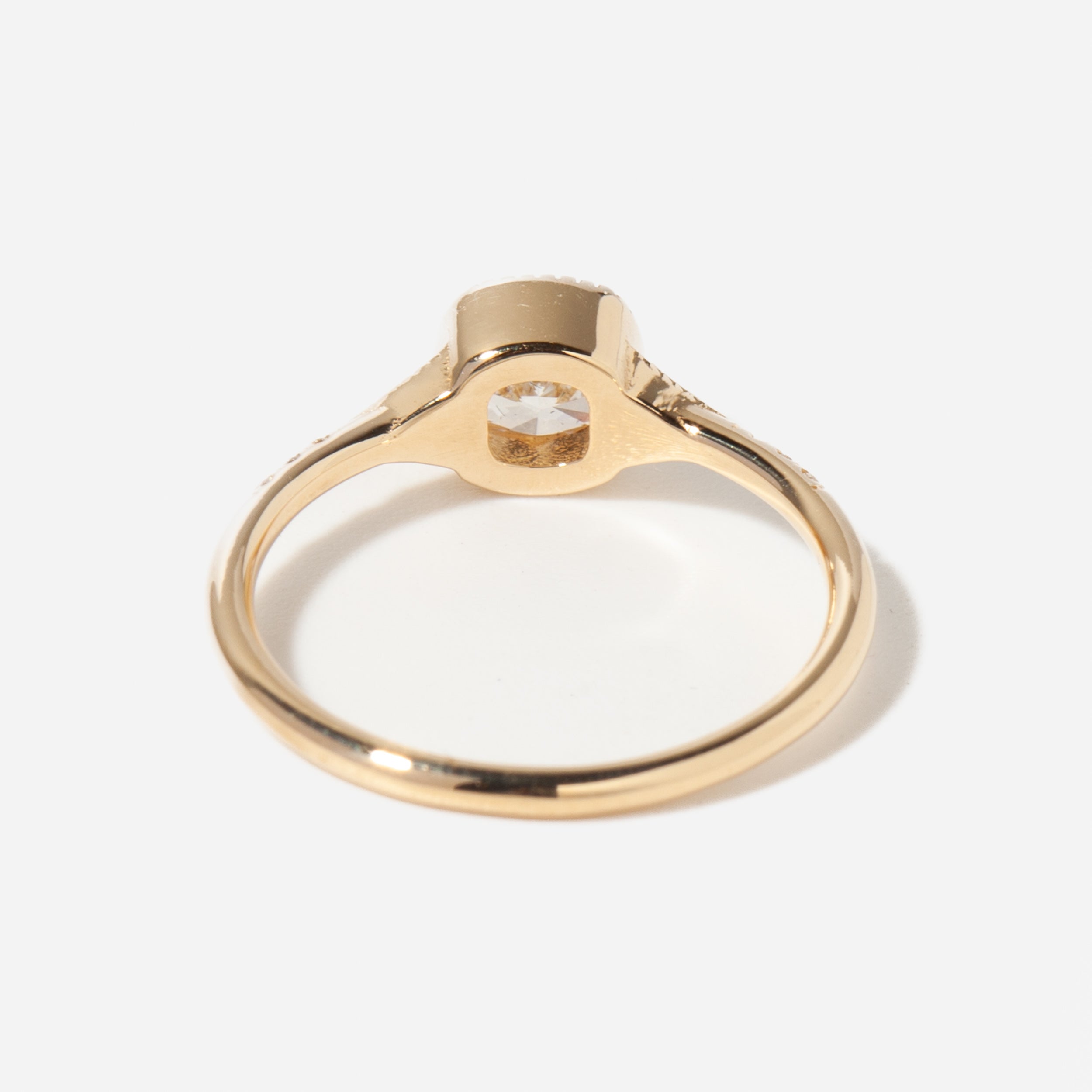 14 karat gold with a 5mm cushion-cut white diamond, two 1.5mm diamonds, and six 1 mm diamonds.