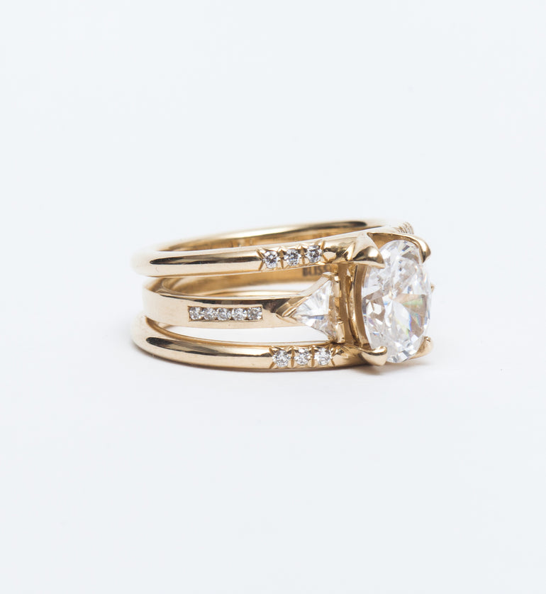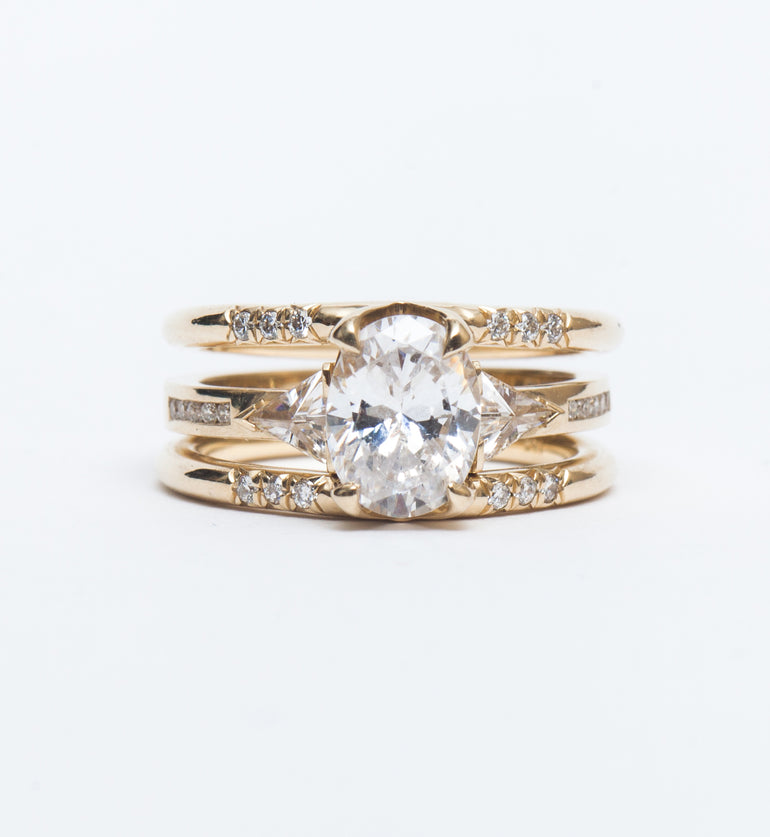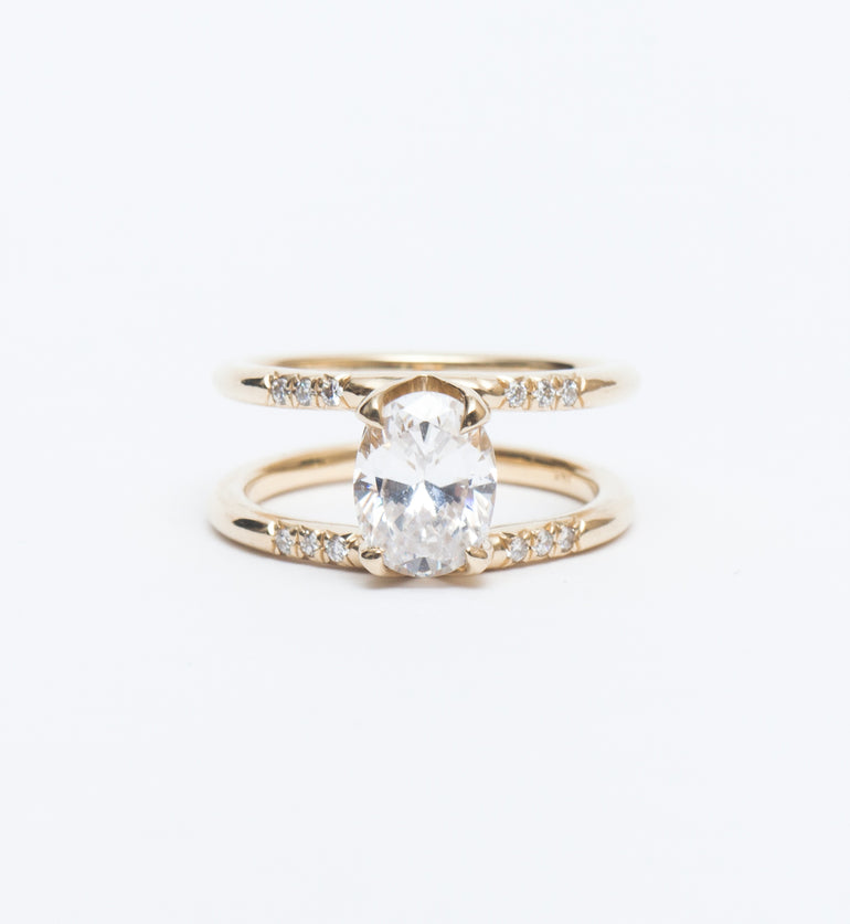 14 karat gold with approximately 1.5 carat oval white diamond with 0.09 carats of white diamond pavé.