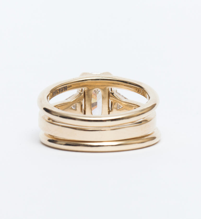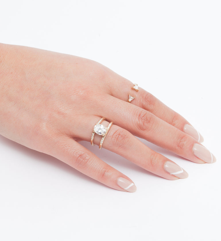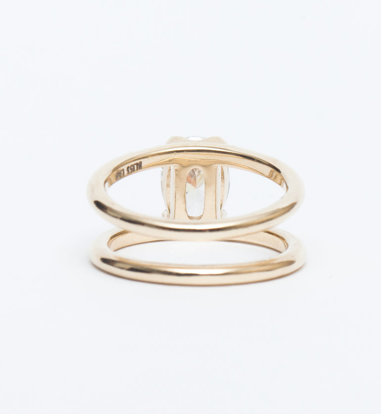 The contoured bands and clean lines of this oval-set ring gives the solitaire ring a thoroughly modern context. Wide, flat prongs frame the oval's sparkling cut with both rounded edges and sharp corners. Slip the matching Magnetic Ring inside for an astonishing combination that brings bridal jewelry into the 21st century. Made in the U.S.A.