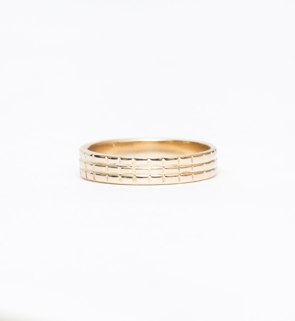 The architectural form of shoji doors directly informs the hand-carved pattern on this unisex band. Washi paper and wood are transformed into solid gold, each rectangle carved one at a time for a perfectly imperfect finish that will weather with age and wear. Forever changing and forever the same; a perfect way to say "I do". Made in the U.S.A.