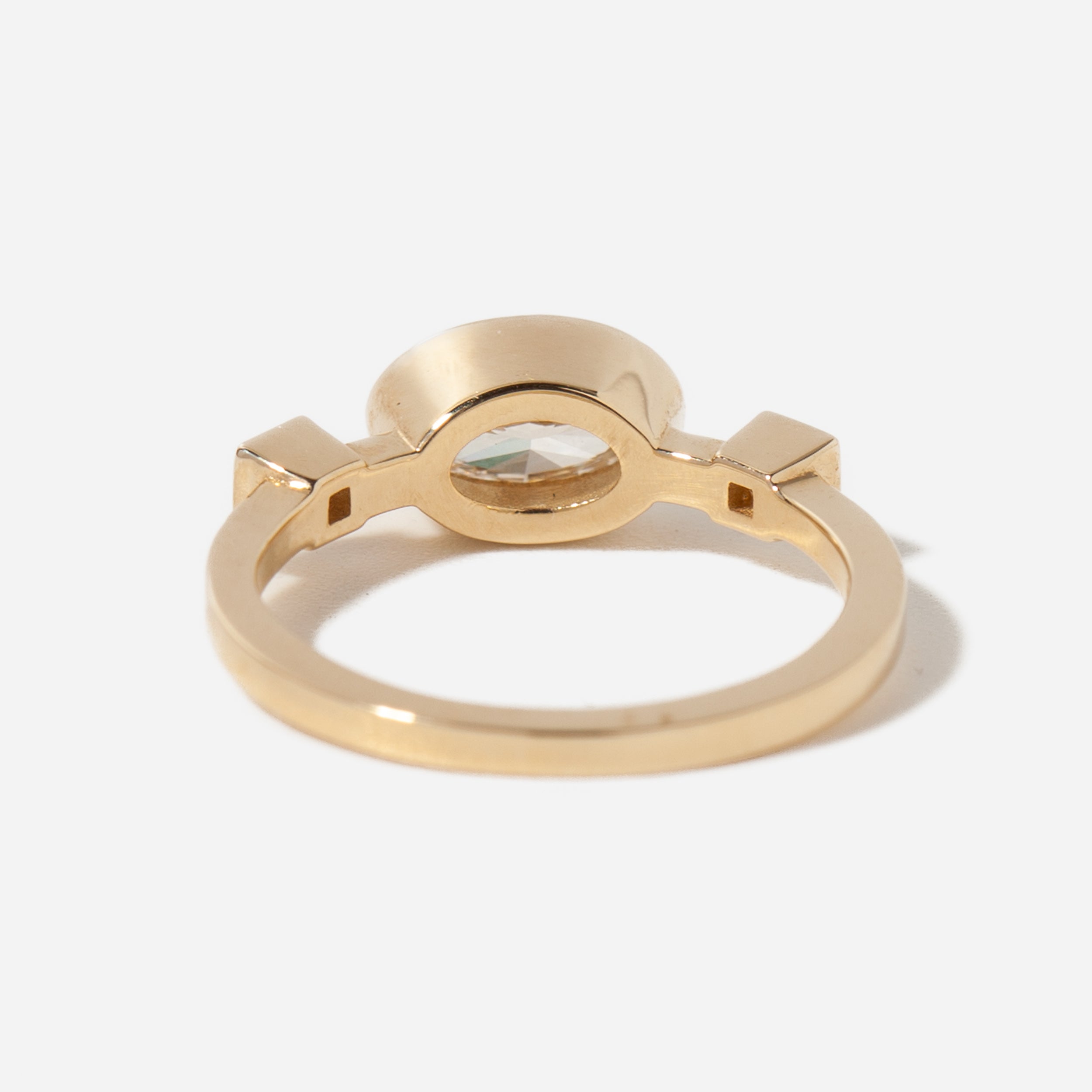 Inspired by the Hikaru Series by designer M.Hisae, this unique ring showcases a stunning oval diamond surrounded by a golden bezel and accented with round and princess-cut diamonds. Perfect for those seeking a non-traditional engagement ring or a sparkly addition to their everyday stack. It's truly a gem that embodies your vibrant inner light, formed over millions of years on Earth. Made in the U.S.A.