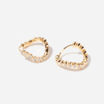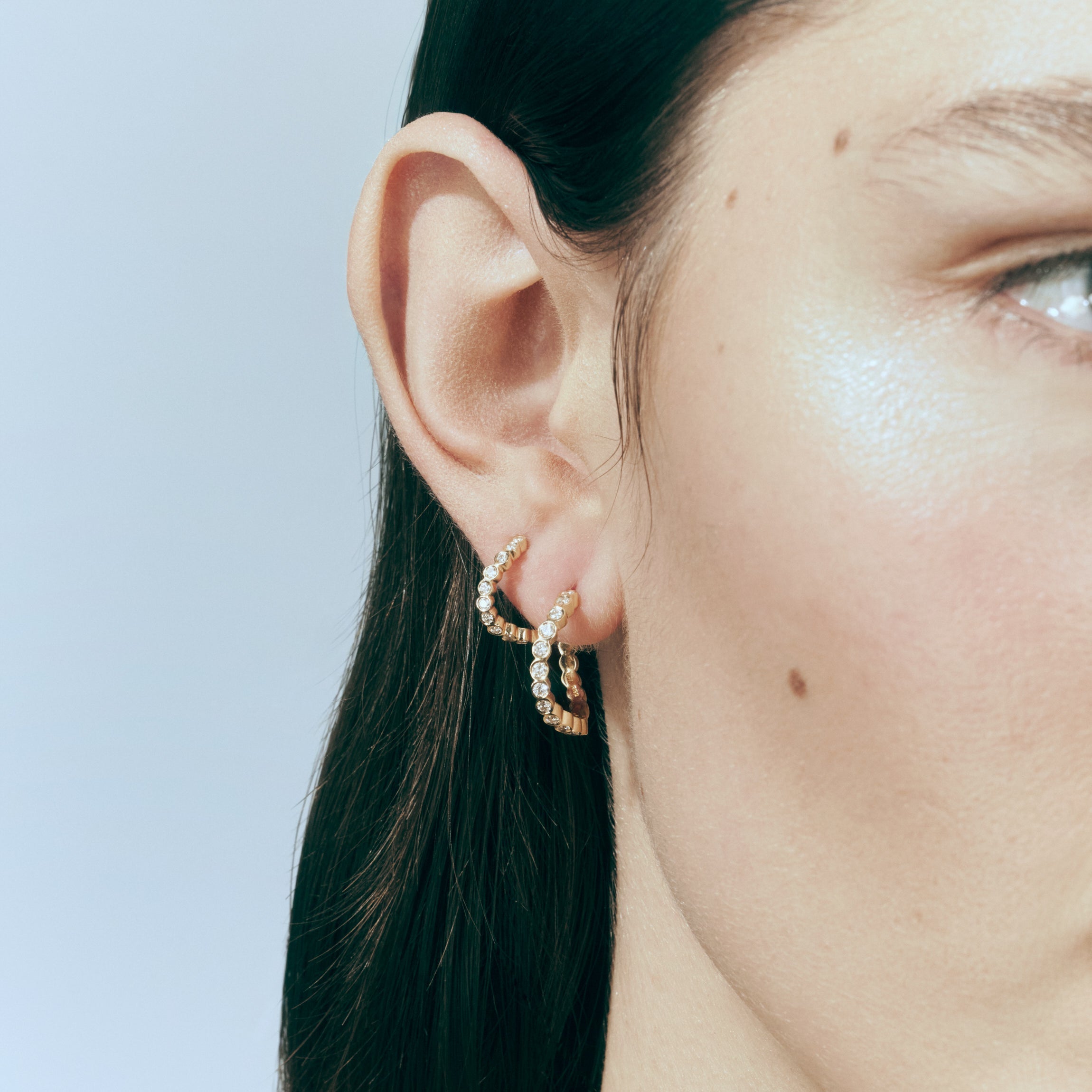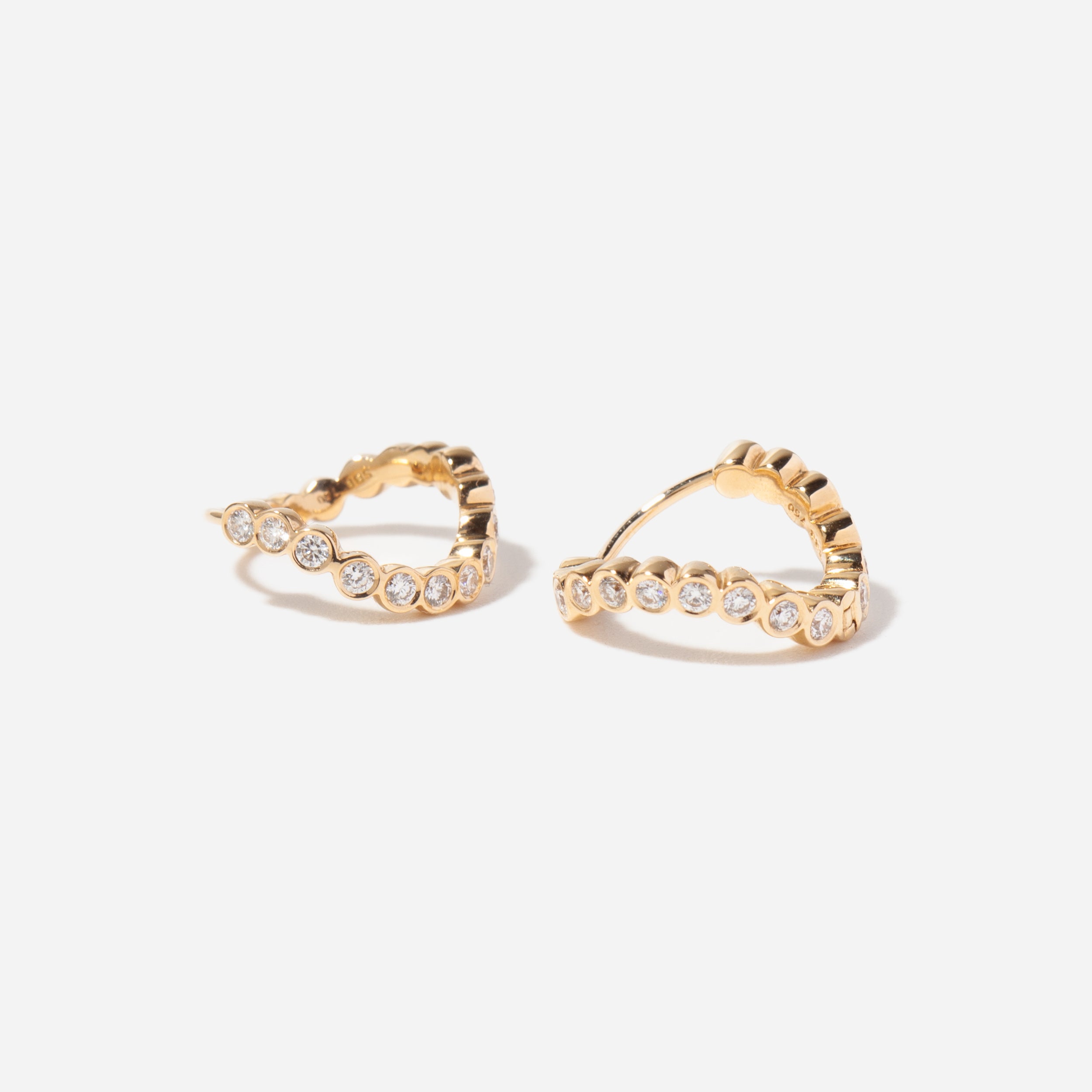 A delicate, smaller take on the Courant earring, these hoops showcase a smoothly curved gold band gracefully embraced by shimmering brilliant cut diamonds nestled in secure bezel settings. Their refined elegance captures timeless beauty, making them a perfect pair to elevate any ensemble with subtle romance and sophistication.
