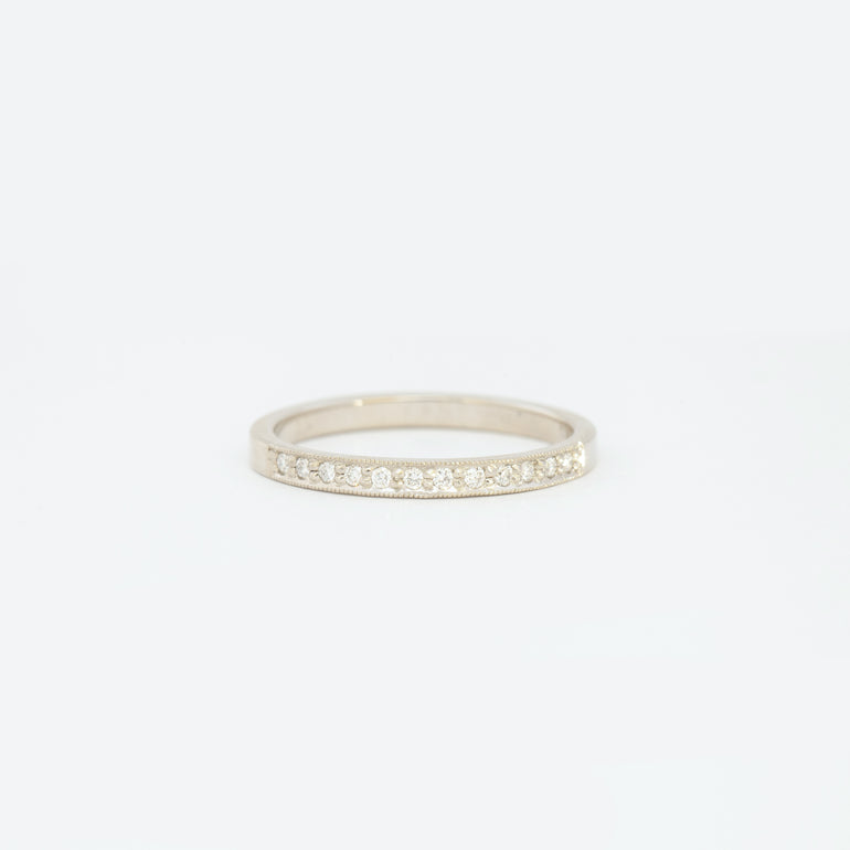 Effortless and elegant, this signature Jennie Kwon band dusts the surface of a minimal square band with both pavé set diamonds and the designer's signature milgrain beading. The straightforward design and classic sparkle makes it perfect on its own and an ideal stacker. Pair it with a low-set solitaire for understated grace. Made in the U.S.A.