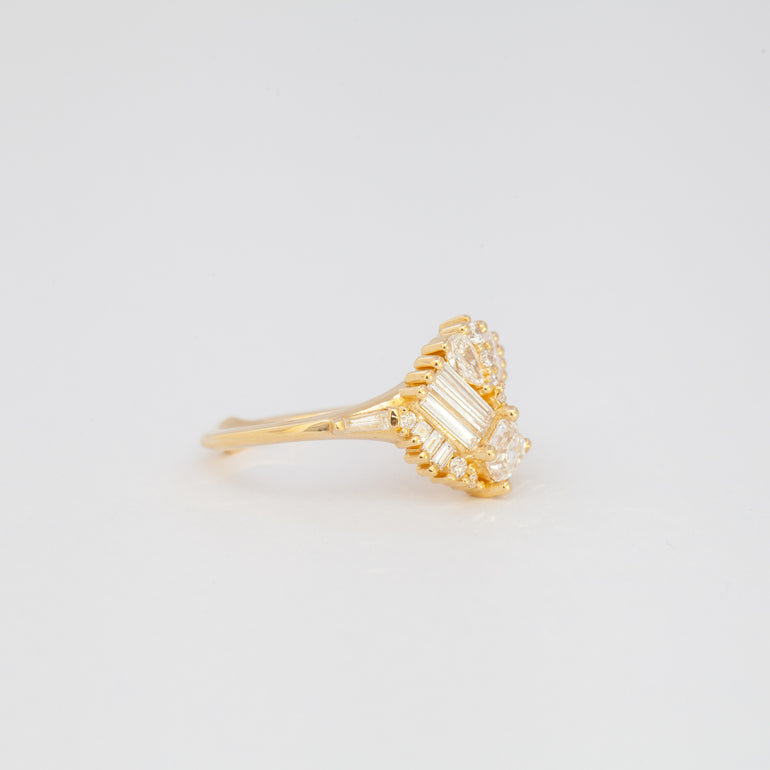 Soft curves, straight lines, and delicate beads combine for a diamond-encrusted style that's surprisingly easy to wear. Despite the staggering number of diamonds on your hand (twenty-seven; we counted), the low-profile design makes this ring incredibly easy to wear. By using both dazzling brilliant cuts and shimmering step cuts, the Artemer designers create hypnotizing mix of textures and forms. Made in Israel.