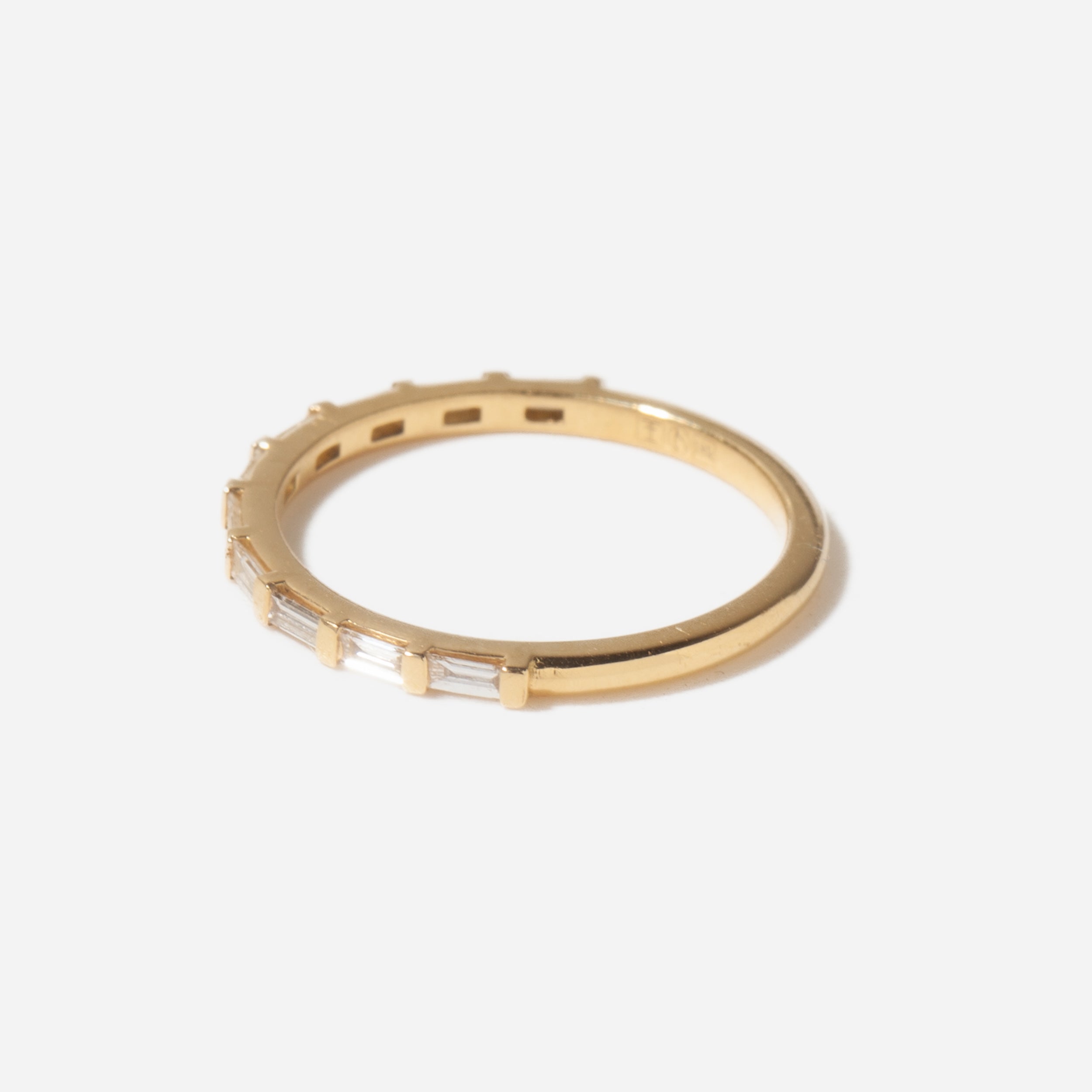 Exquisite and glittering, The Future Fine's newest band is a must-have stacker. Gleaming white baguette diamonds grace the front half of the ring, radiating a unique glow. Elevate your engagement ring with this stunning contrast between shapes and sparkle–crafted in the USA.