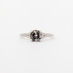 Two pairs of angled lines frame the center of this updated solitaire with delicate negative space before combining into a slim, comfortable band. Inspired by the bright flashes of distant stars, this Nova is set with a salt and pepper diamond that sparkles like the night sky.