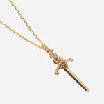 The Sword of Courage Pendant combines timeless symbolism with refined craftsmanship. This striking golden sword features an authentic Canadian diamond, celebrated for its ethical sourcing and exceptional brilliance. Suspended from a delicate yet resilient cable chain, the pendant balances visual elegance with structural integrity. The contrast between the sword's bold geometry and the chain's refined links creates a sophisticated aesthetic suitable for both everyday wear and special occasions. A meaningful piece that speaks to strength and integrity.