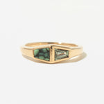 A tapered baguette-cut variscite and a richly veined turquoise green Montana sapphire. The sapphire's cool, faceted brilliance plays beautifully against the variscite's deep, layered foundation, two stones united in a single, striking design.