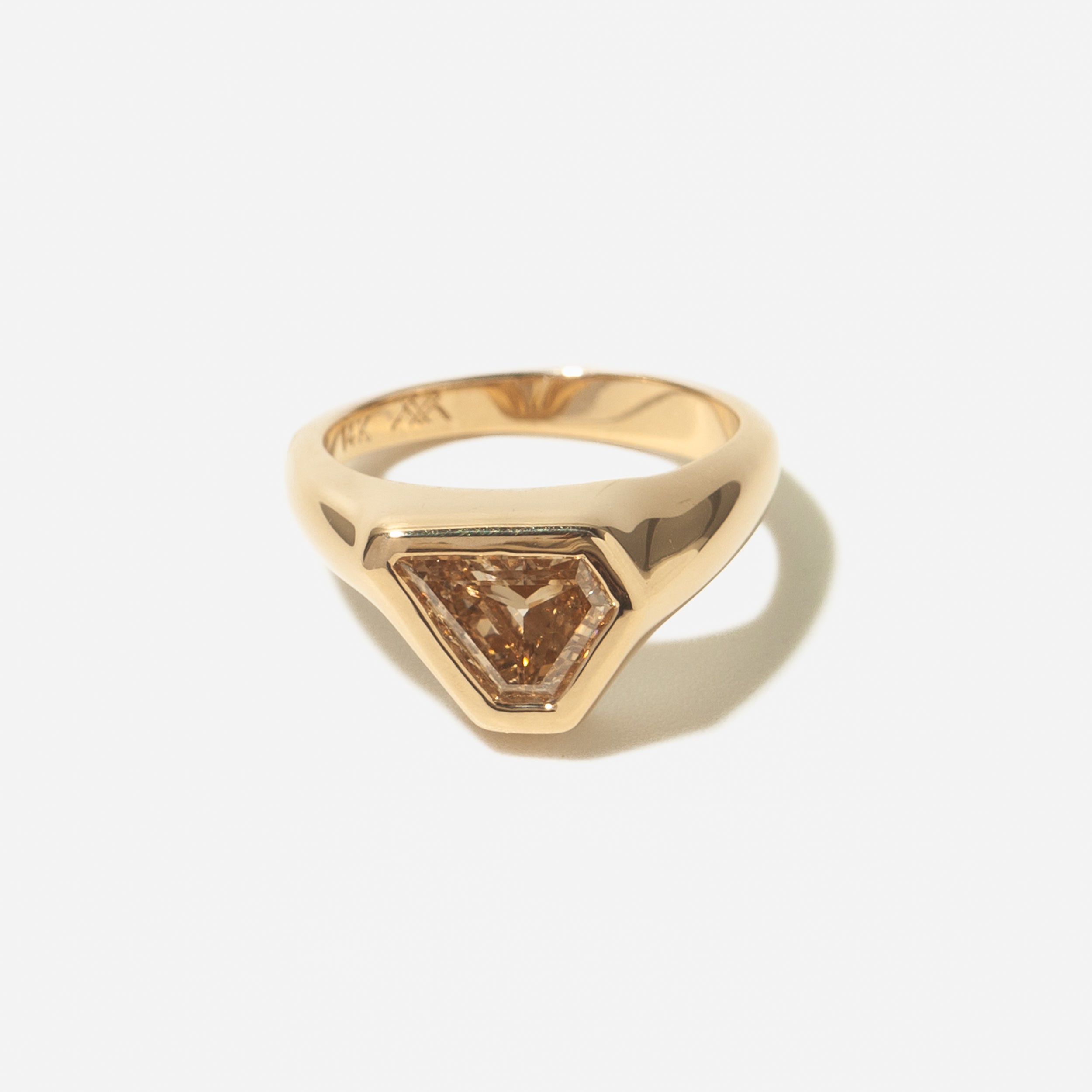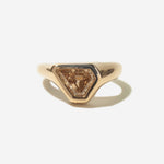 A striking one-of-a-kind signet ring featuring a warm brown diamond with geometric facets that catch light from every angle. This unique stone captivates with rich, golden undertones and commands attention from every view.