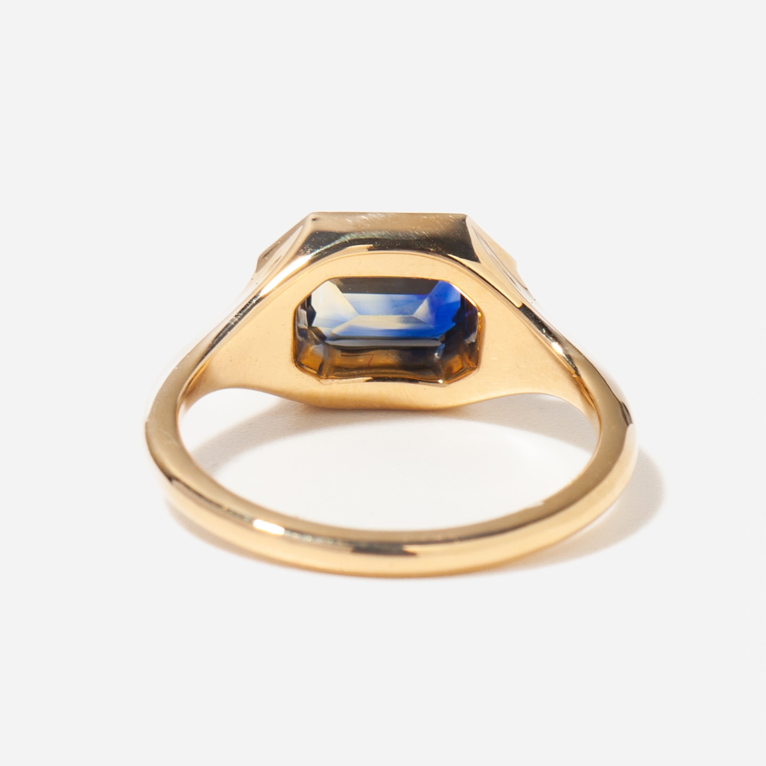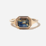 A stunning parti sapphire, boasting a blend of blue, green, and brown hues, is adorned with delicate step-cut trapezoid diamonds outlining the center stone's sleek octagonal shape. This one-of-a-kind ring is perfect for engagements or simply as a just because ring, what we know for sure is you will want to be wearing this ring every day.
