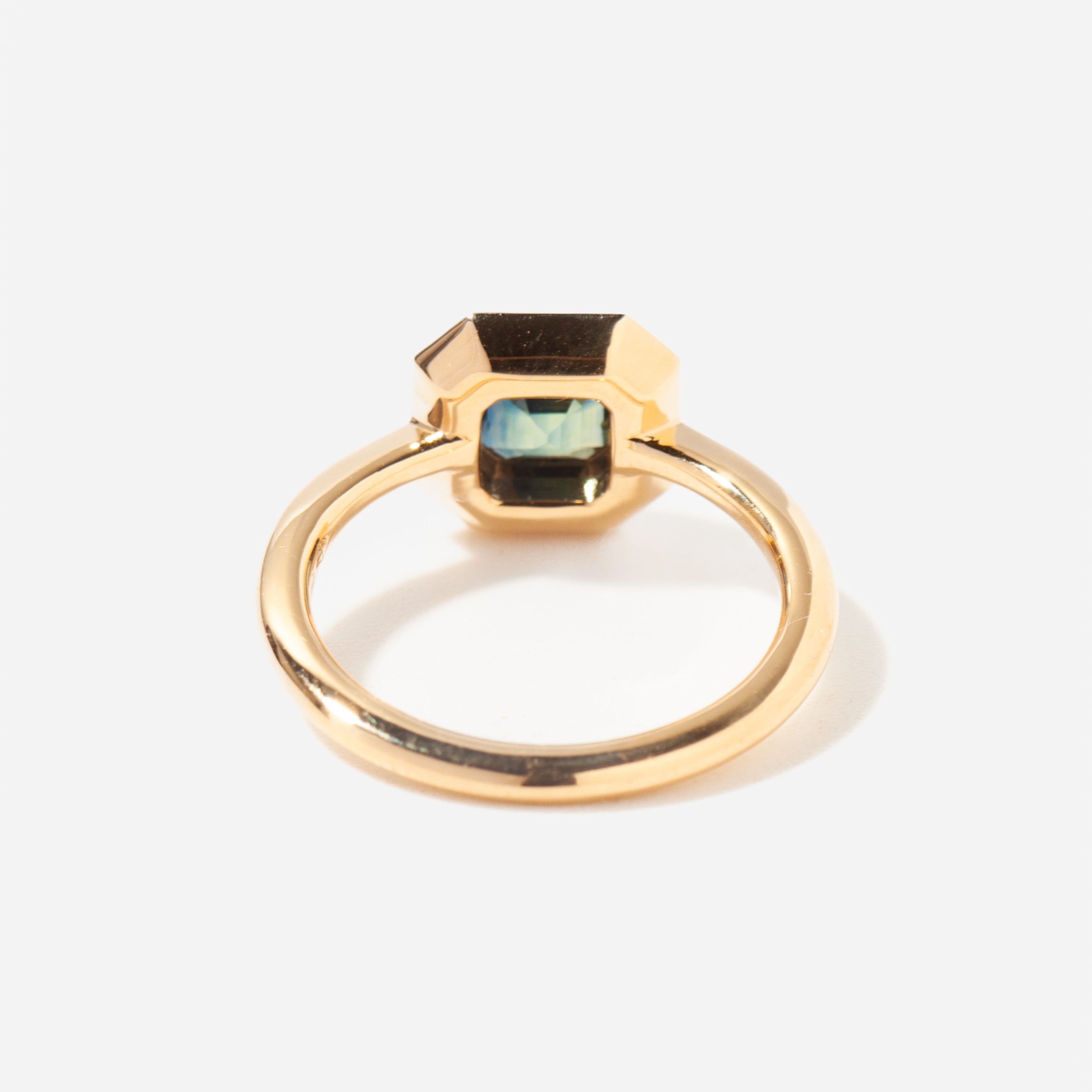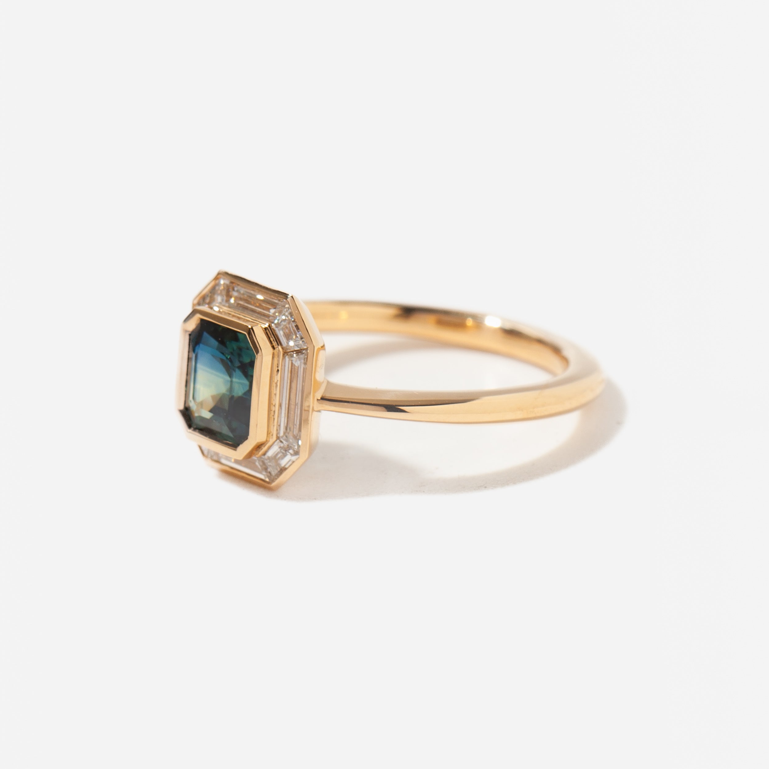18 karat yellow gold with a square emerald-cut parti sapphire totaling 1.07 carats and trapezoid cut diamonds totaling approximately 0.40 carat (VS clarity, G+ color). Handmade in Israel using conflict-free diamonds.