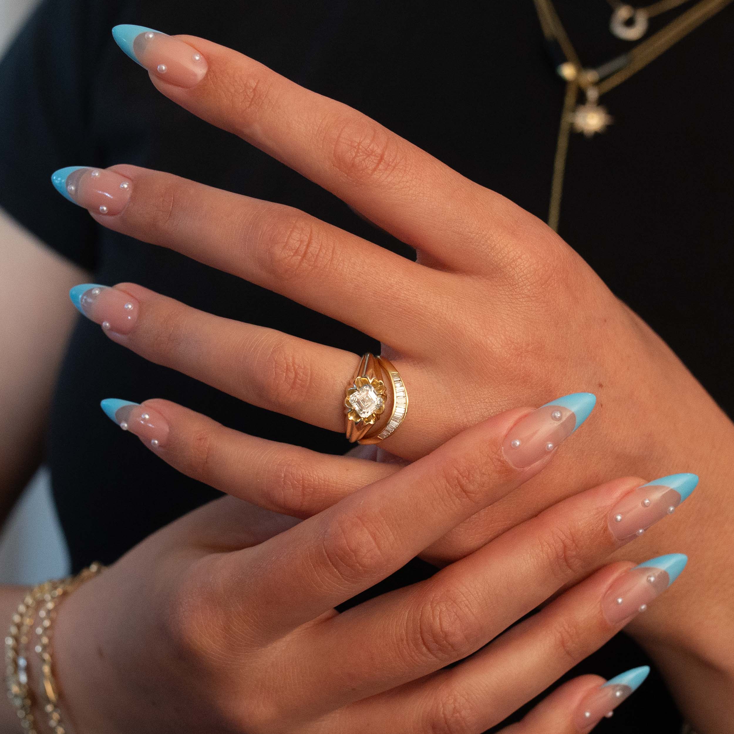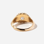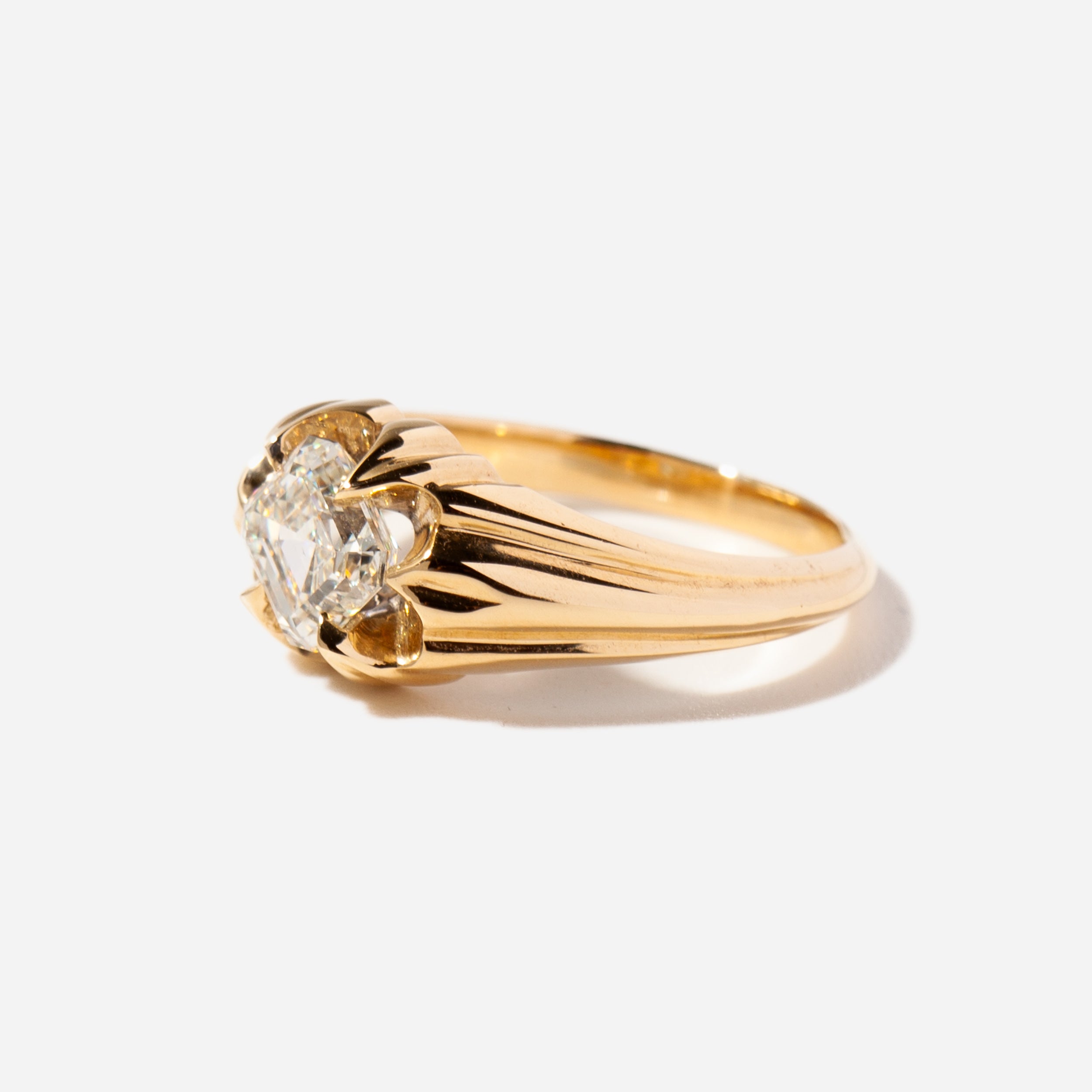 Inspired by the antique belcher style, which originated in the 1800s, this gorgeous ring features a center stone held by prongs which are cut out of the shank. The shape of the prongs cut out of the setting give it a unique flower-like appearance.