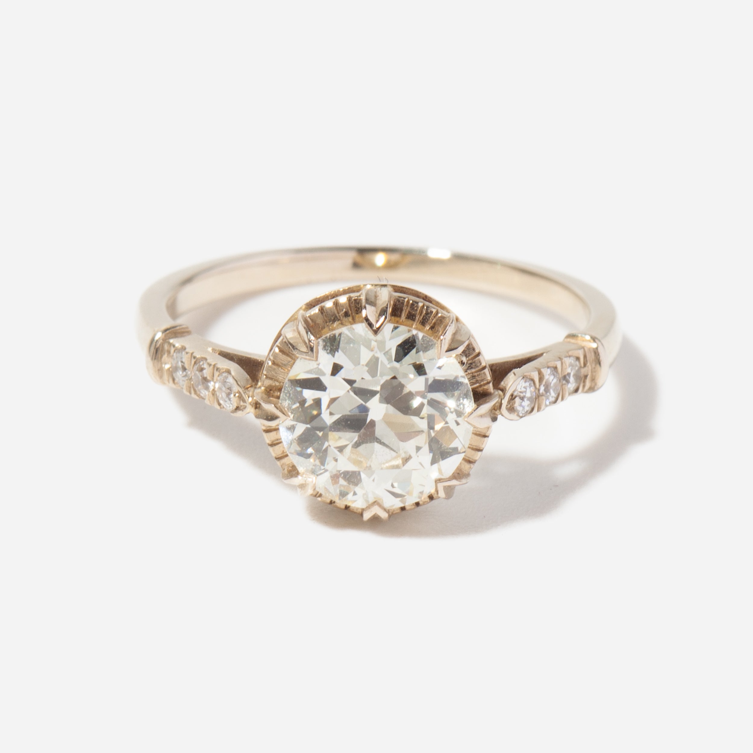 This stunning one-of-a-kind ring by Single Stone blends antique-inspired design with unmatched craftsmanship. In its center is an icy Old European round diamond cradled in a textured halo of white gold and eight inverted knife-edge prongs. Set low and close to the skin, this ring ensures comfort while sparing no sparkle. Made in Los Angeles.