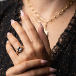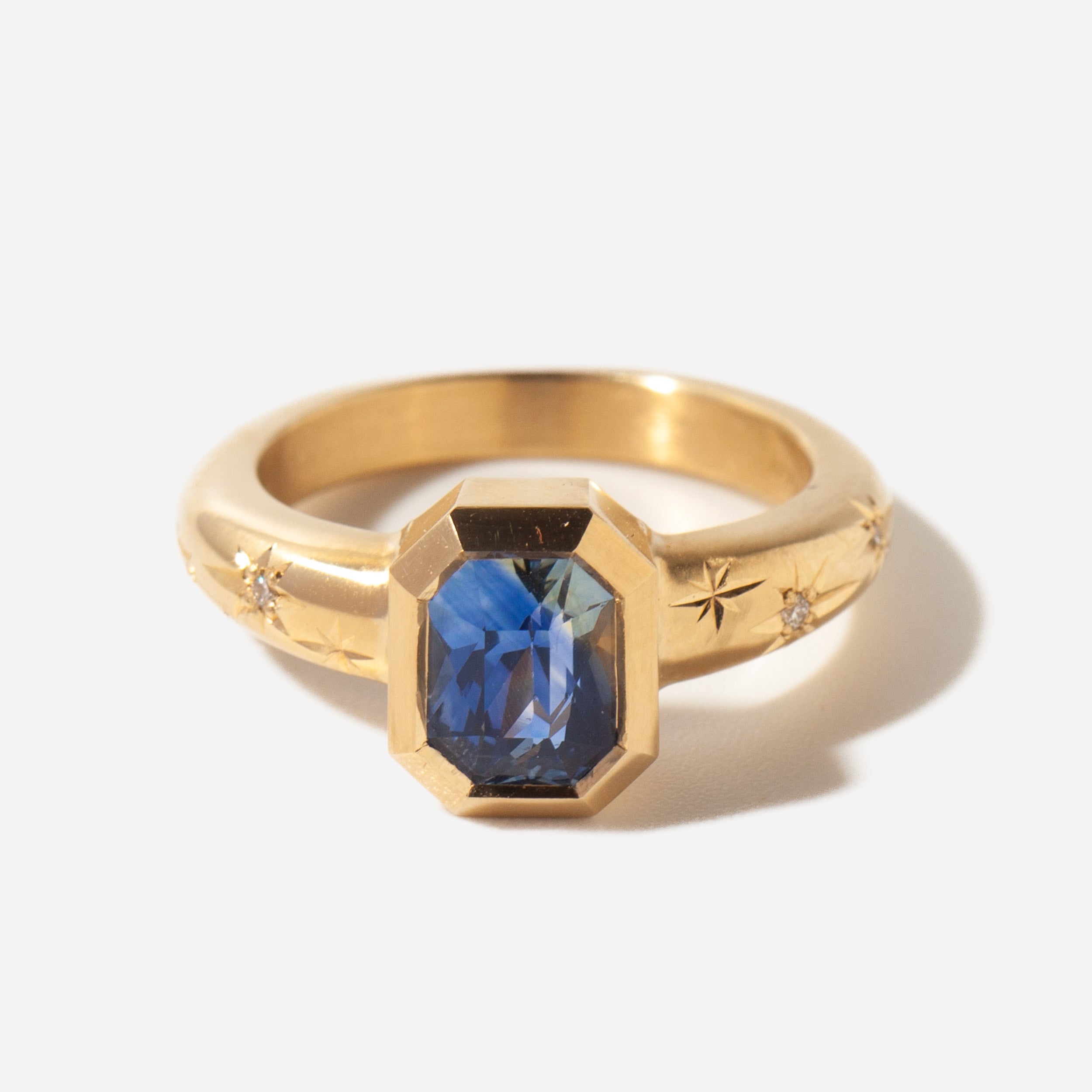 Known for her remarkable hand-made, artistic pieces, Melissa Scoppa wows us with her brand-new solitaire collection. With a chunky bezel set around the center blue sapphire that pairs playfully with the weighty band, this is the perfect ring for someone looking for something more bold. Sparkling diamonds set at the center of these hand-engraved rays catch the light from every angle. Made in the U.S.A.