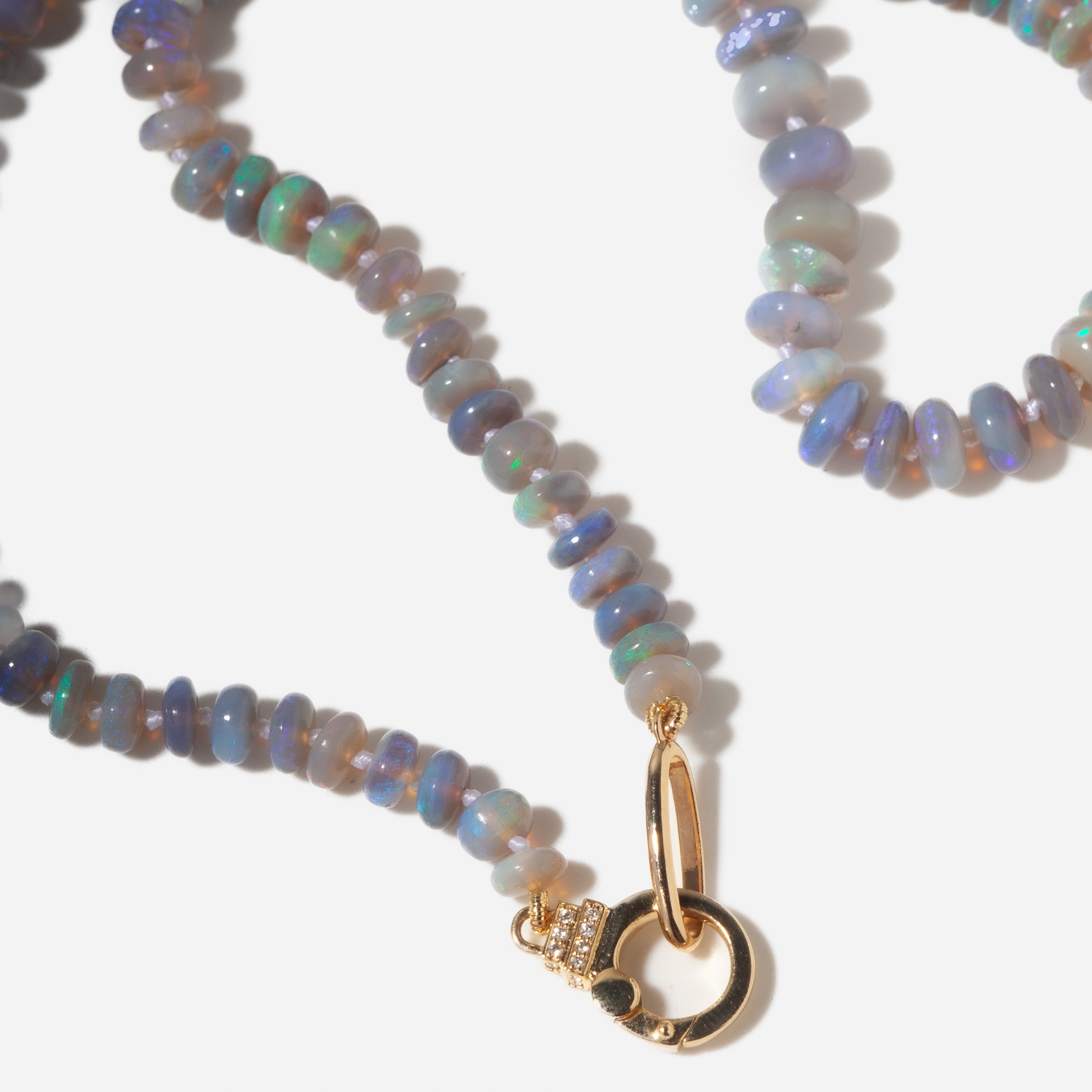 Add some color to your jewelry game with this one-of-a-kind opal beaded necklace by New York jewelry design house, Sorellina. Adorned with a gorgeous gold clasp decorated in dazzling diamonds, this necklace is not something you see every day. Known for creating bold statement pieces by seamlessly blending opposing ideas of feminine with masculine and vintage with modern, this hand-beaded piece is the perfect way to add texture, color, and shimmer to your outfit.