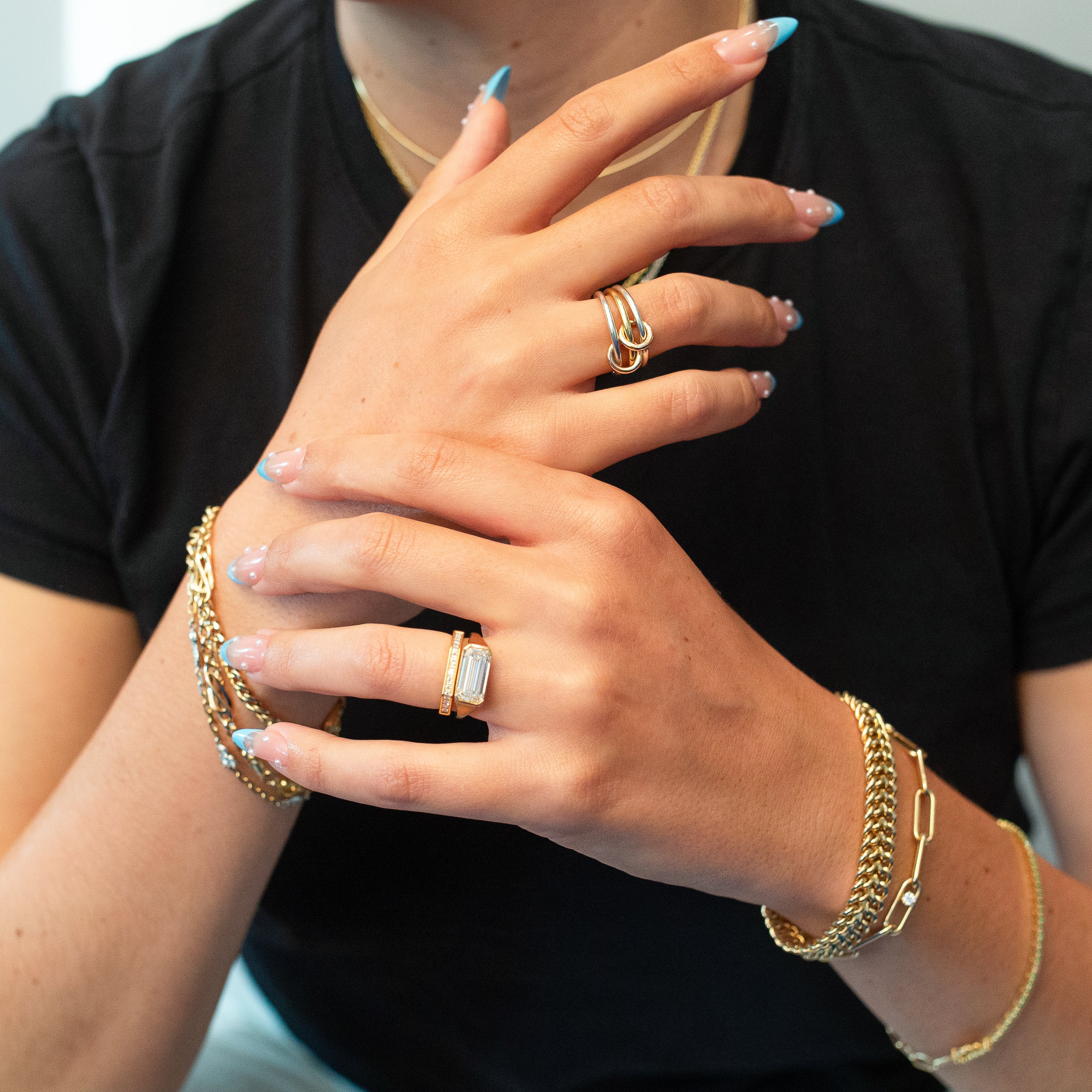 From a simple idea, designers Yves Spinelli and Dwyer Kilcollin have created an entire universe of design. Fabricated entirely by hand out of sterling silver and 18 karat gold, their signature rings start as stacked statement-pieces that can unfold into a constellation of metal and gems. From unconventional wedding bands to modern statement pieces, Spinelli Kilcollin styles capture a world of possibility in your hands.