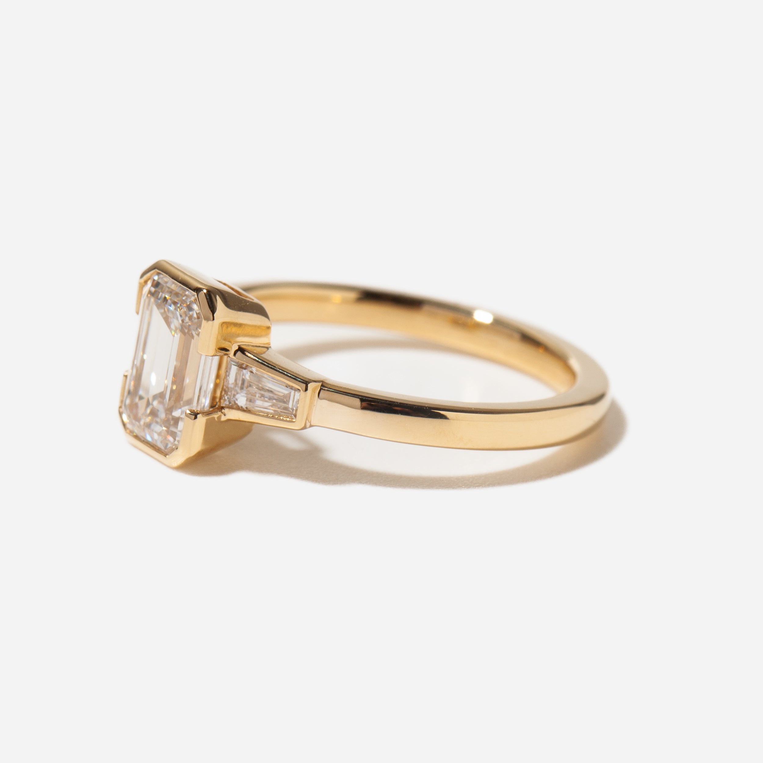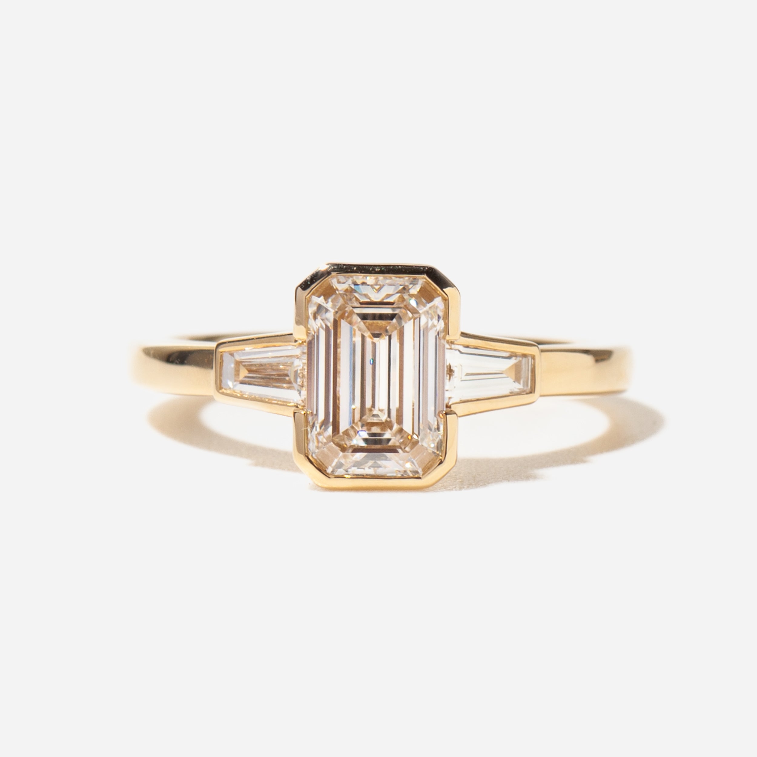 Pictured here with a 1.41 ct (H color/VVS2 clarity) lab-grown emerald-cut diamond and two tapered lab-grown baguette diamonds totaling an additional 0.28 carat.