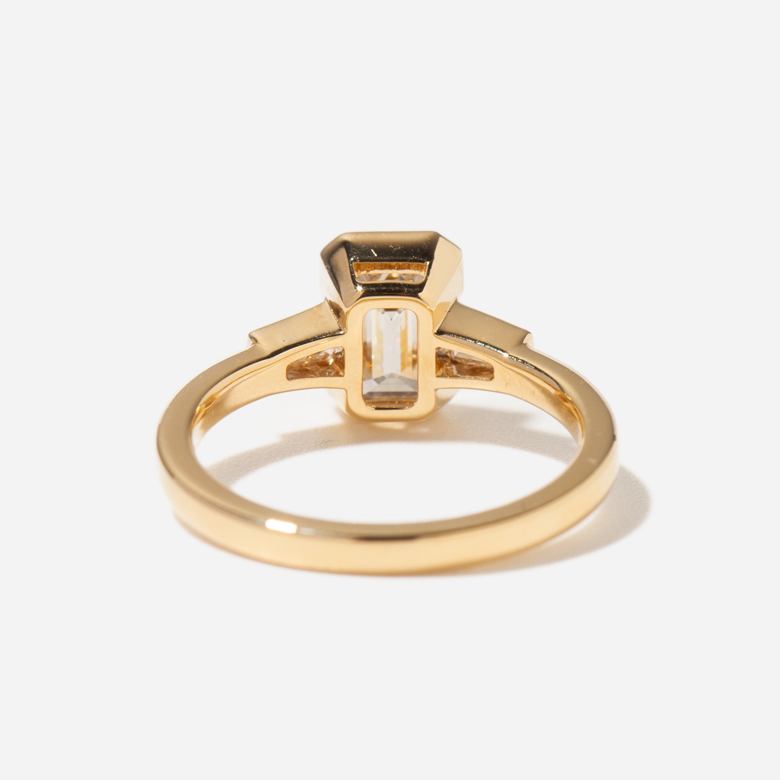 18 karat yellow gold set with an approximately 1.40 ct (GHI color/VS2+ clarity) emerald-cut white diamond with two tapered baguette diamonds totaling an additional 0.28 carat. Looking to customize your center stone? Contact us or book an appointment.