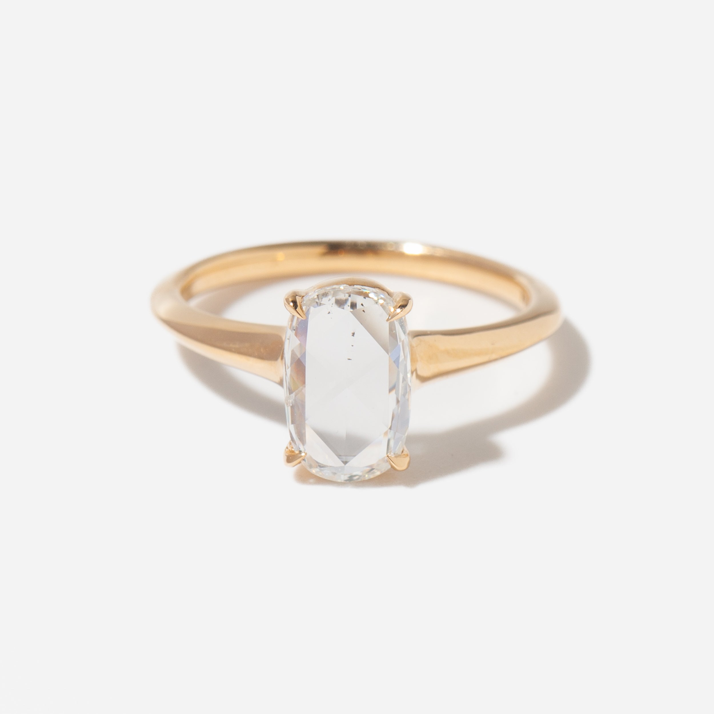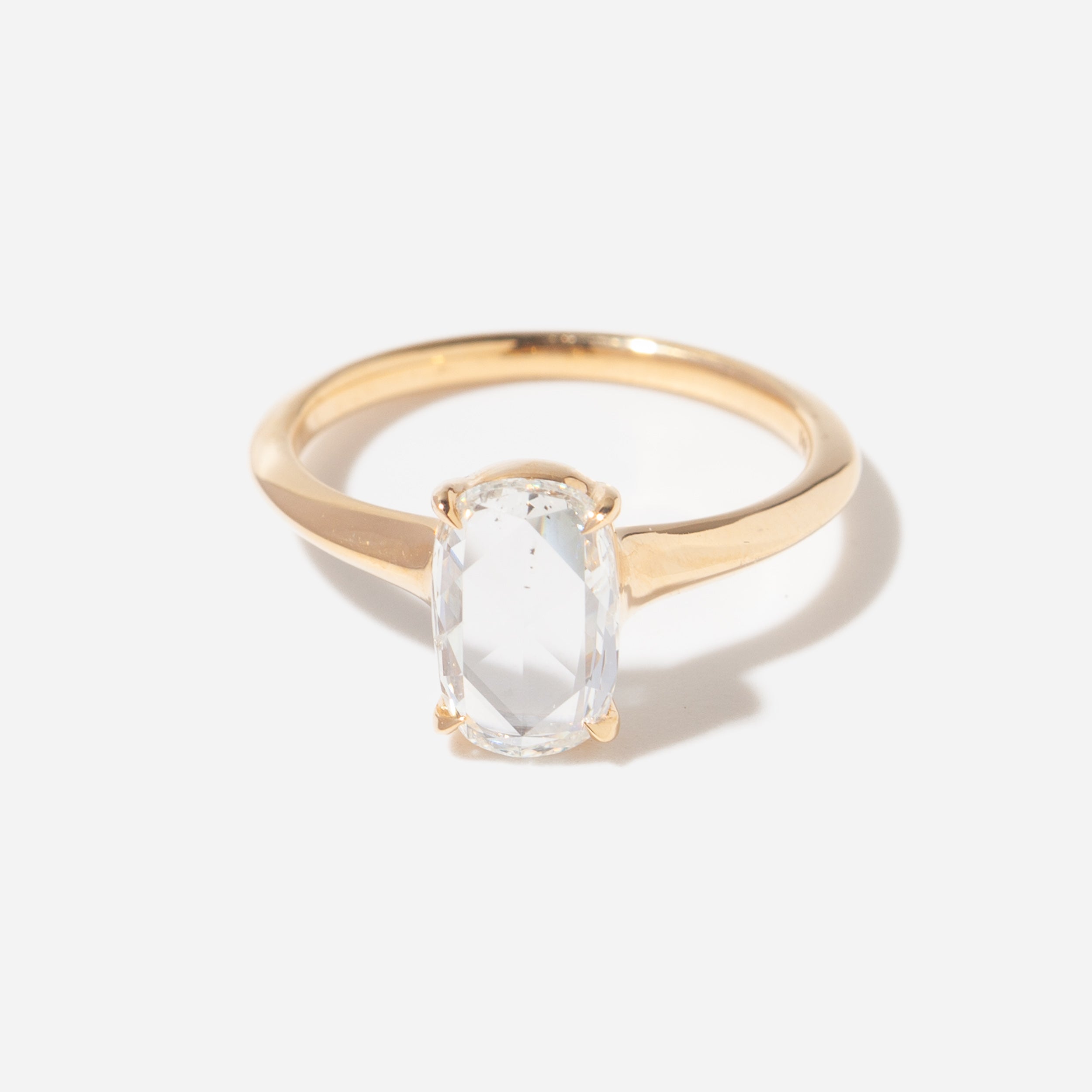 A stunning rose-cut cushion diamond takes center stage in this refined solitaire design. The elongated cushion shape showcases the stone's distinctive faceting, while four delicate prongs secure it with understated elegance. The slightly tapered band adds subtle sophistication without compromising the focus on your exceptional center stone. Perfectly proportioned to complement wedding bands, this timeless setting celebrates the beauty of your diamond with expert craftsmanship and enduring style. Made in the U.S.A.