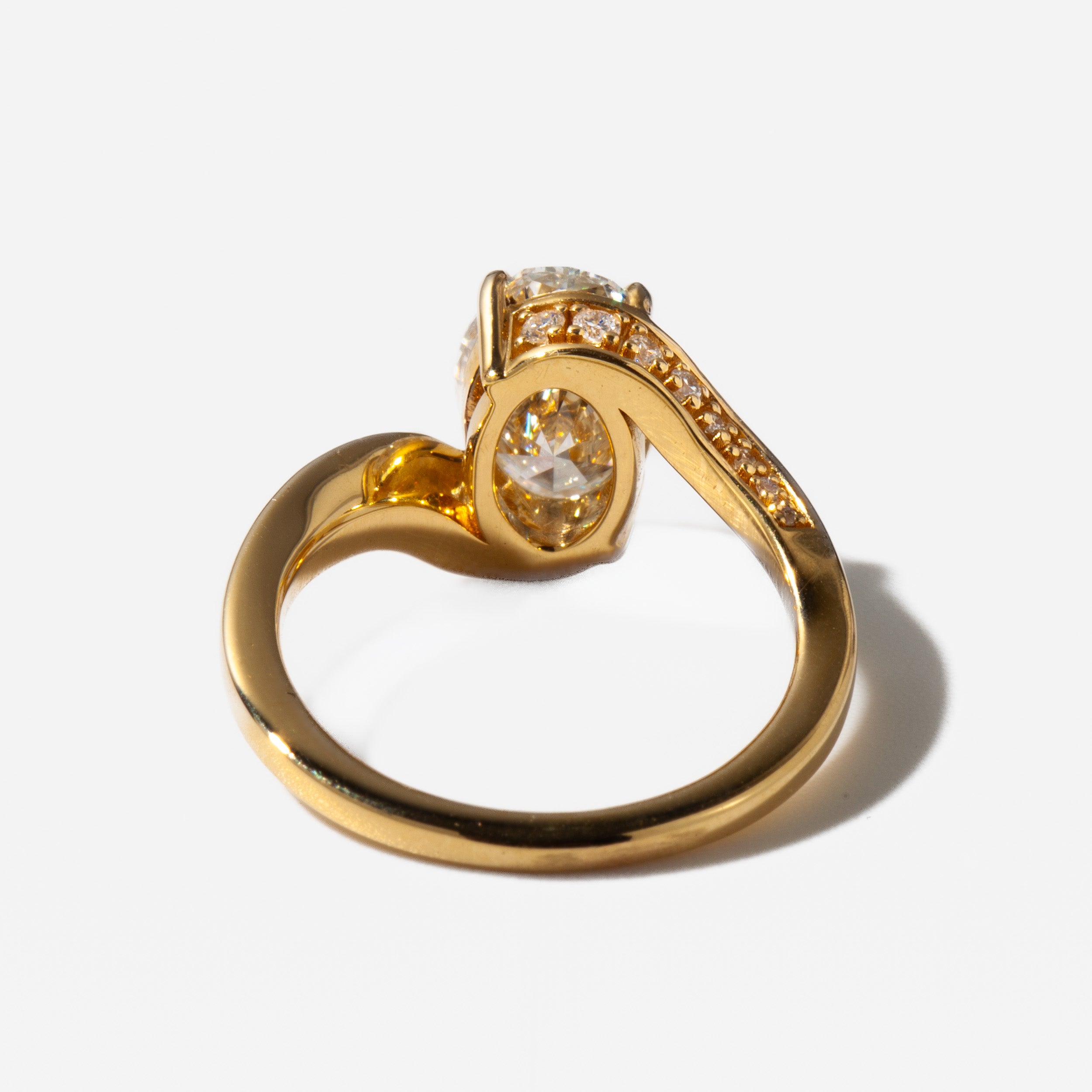 Crafted in 18k yellow gold and shown here with an approximately 2.00 carat IGI certified oval diamond and 20 graduating round pavé diamonds.
