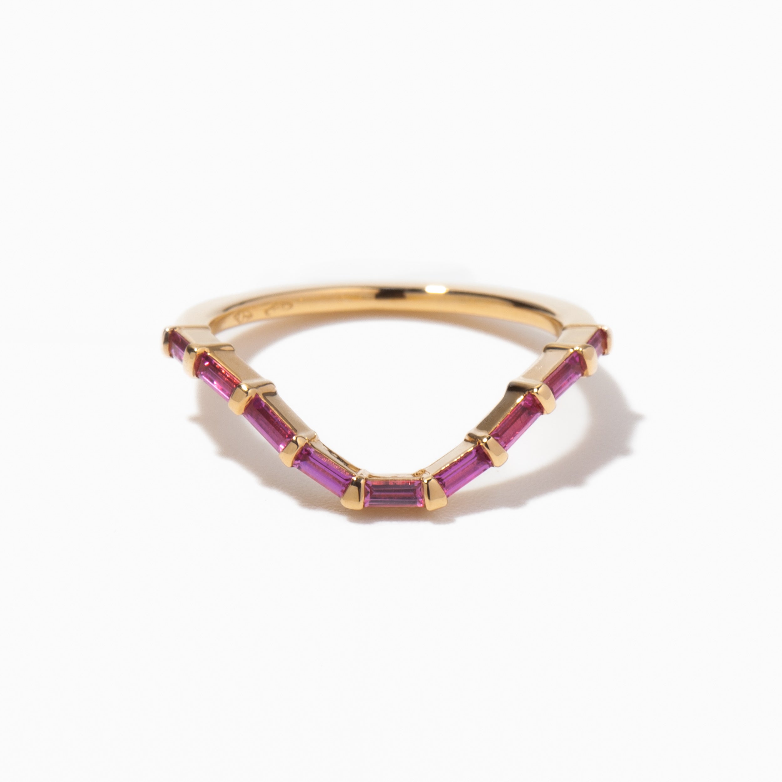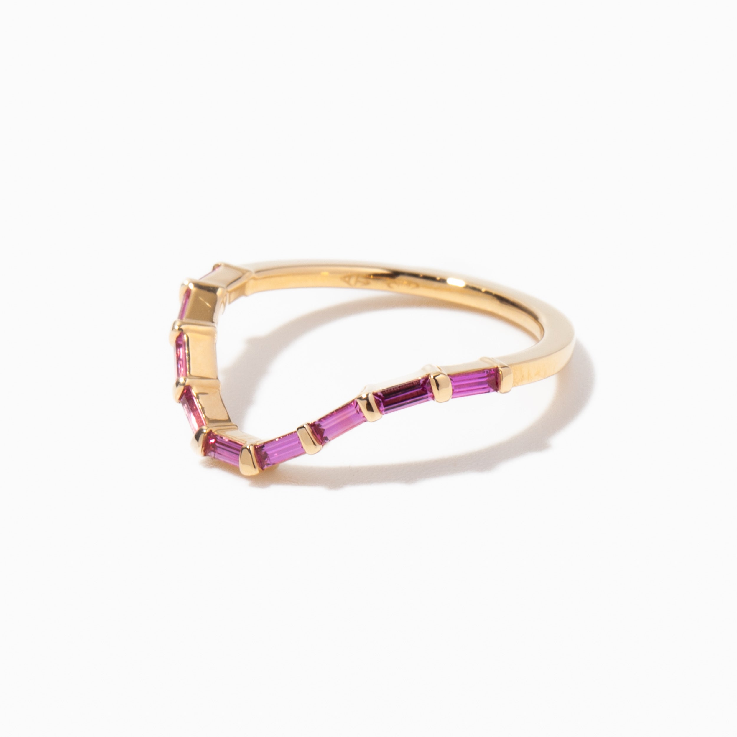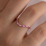 The Curved Pink Baguette Sapphire Ring combines timeless elegance with colorful edge. Crafted from 18K gold, this ring features vibrant pink baguette sapphires set in a graceful, curved silhouette. Pair with your favorite pieces to add a playful pop of color to your stack.