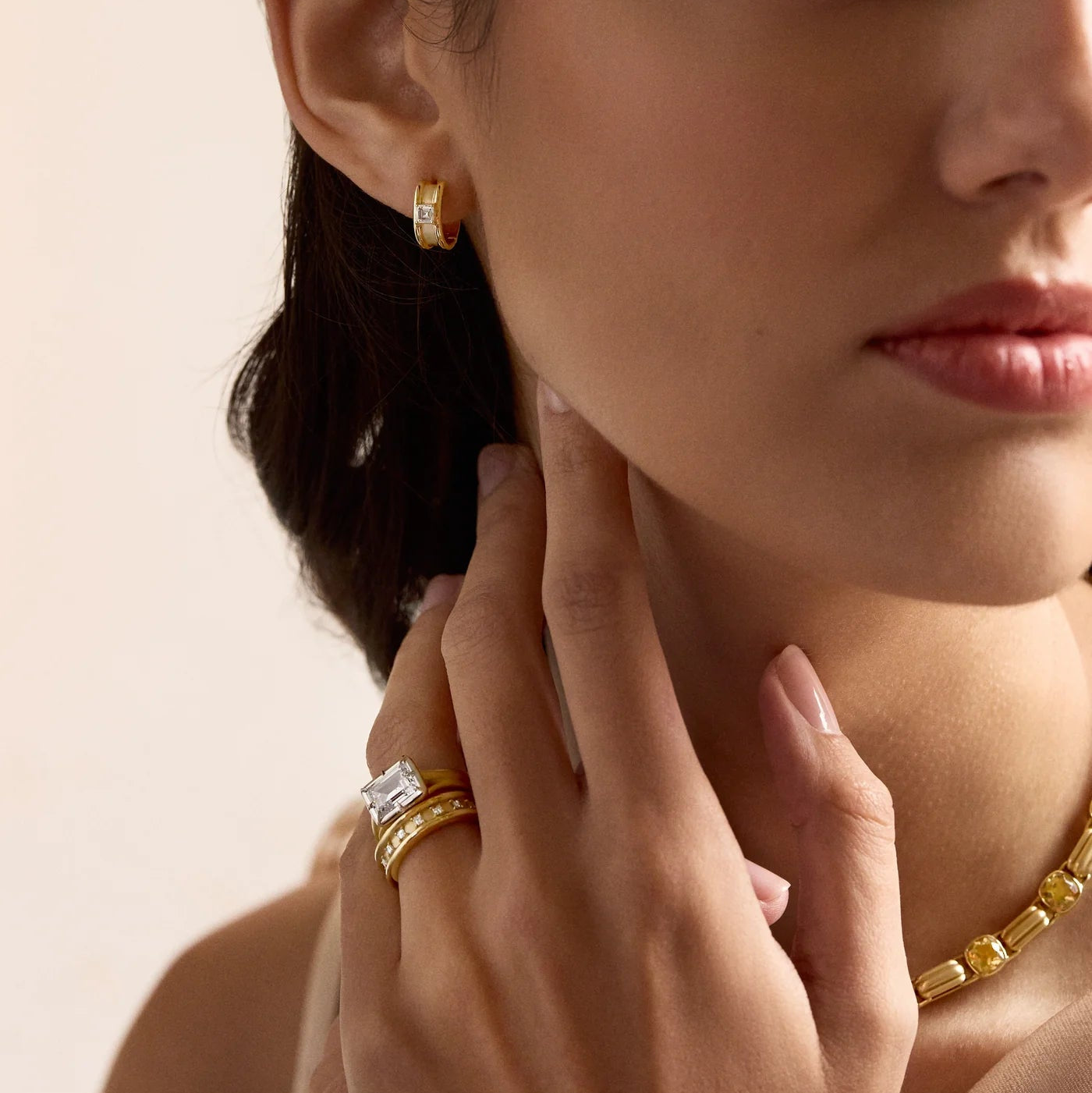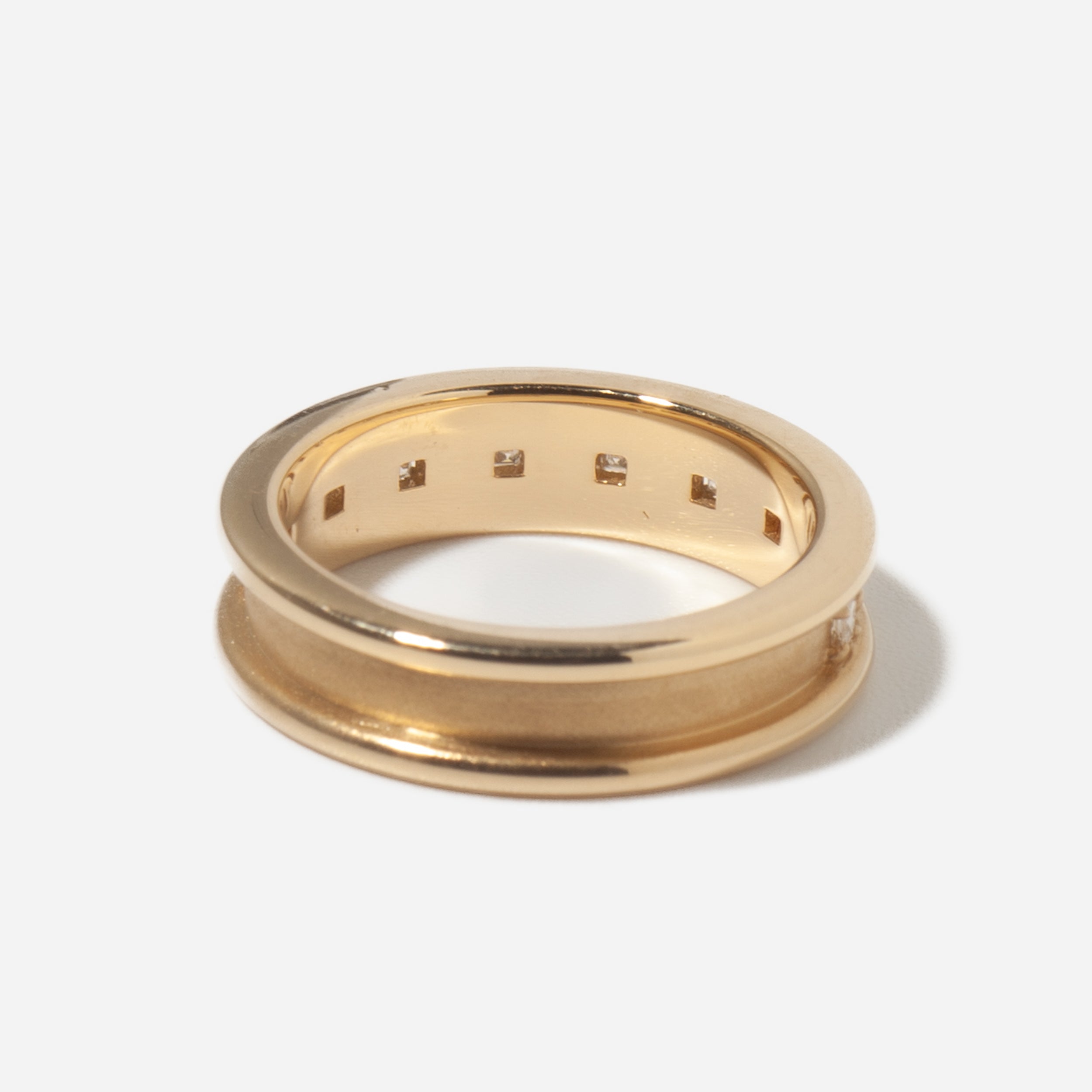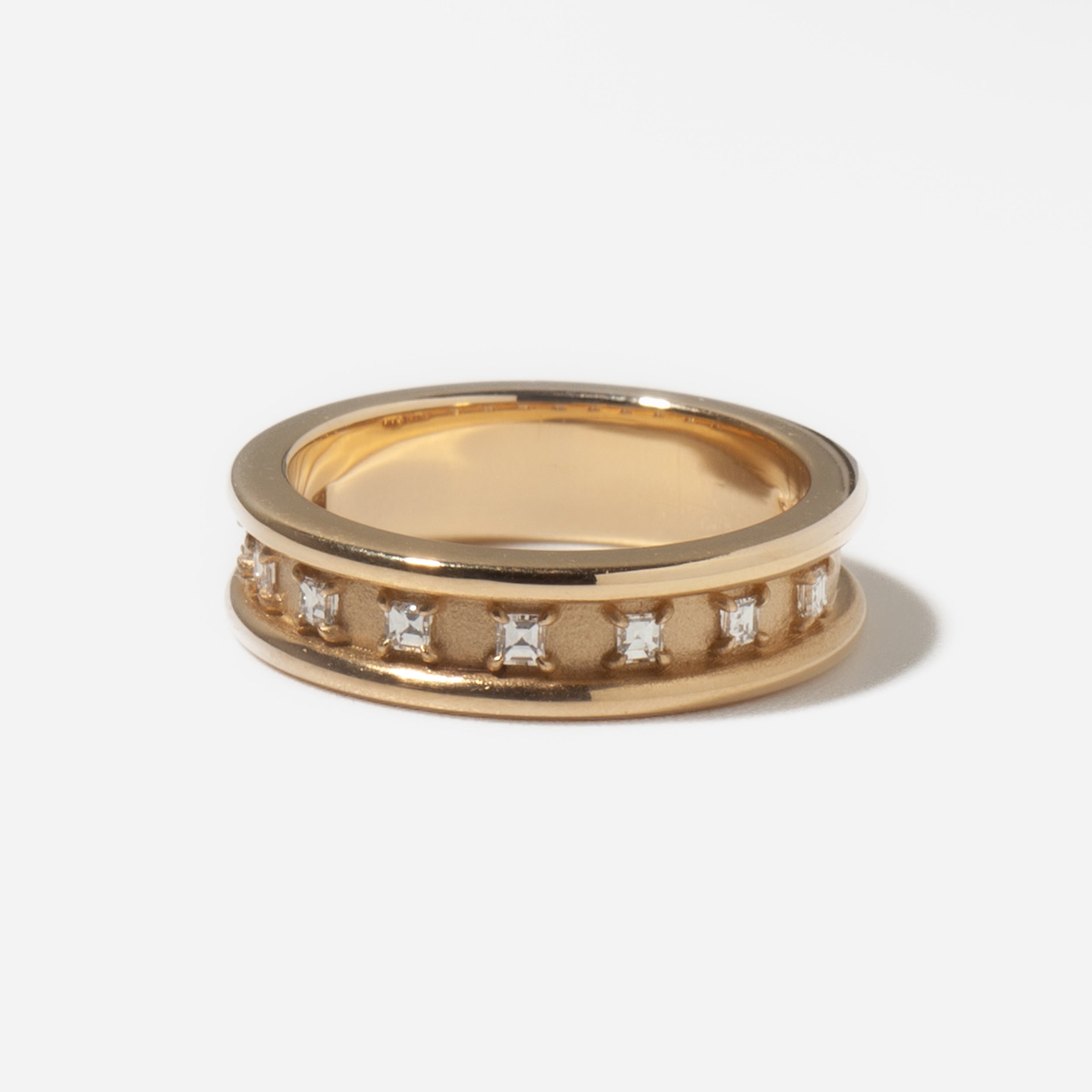 The Diamond Carre Band is a retro inspired ring featuring carre diamonds and a mix of satin and high shine polishing. The domed edges are polished to a high shine, and the center sports a beautiful and soft satin finish. Weighty in gold and smooth to the touch, this band is as wearable as it is luxe.