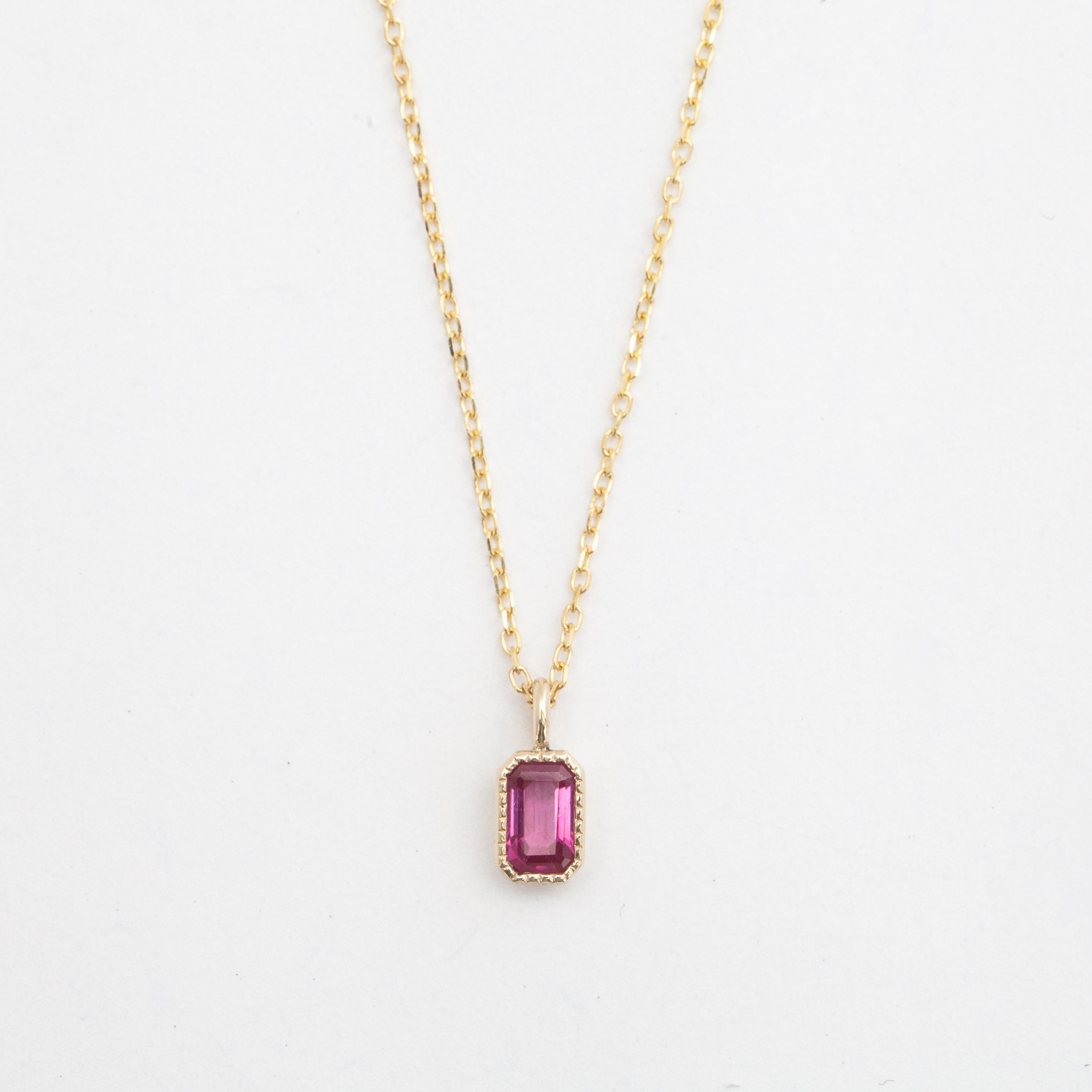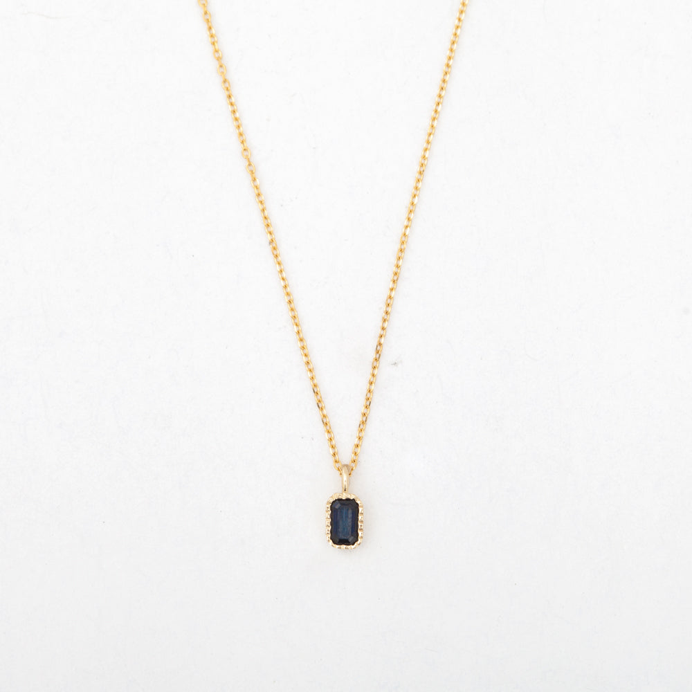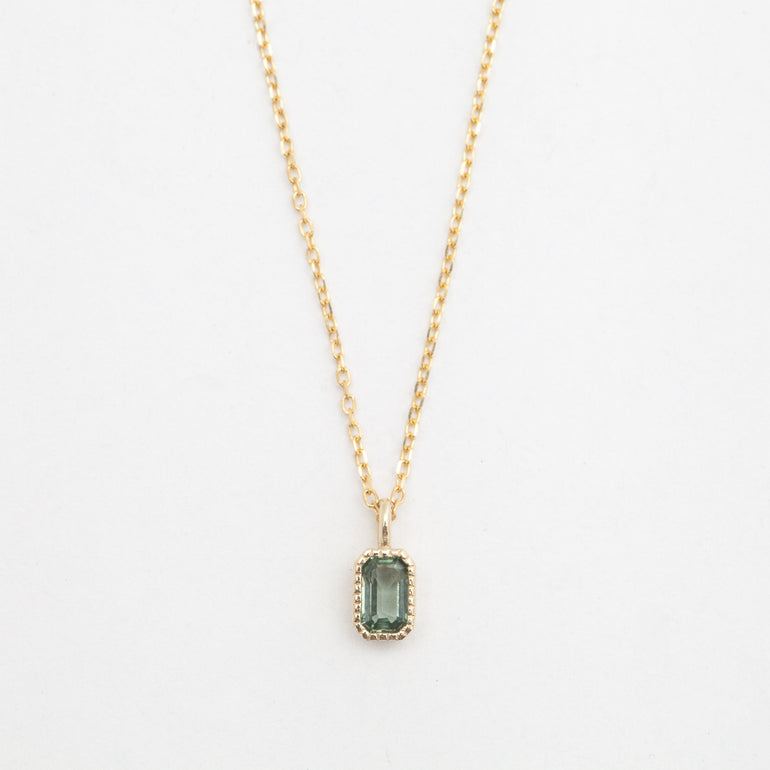 A soft, almost smokey glow emanates from the center of this elongated gemstone solitaire necklace. The lines parallel facets of a green sapphire are framed in bright gold beading with a slim bezel emphasizing the emerald-cut's distinctive silhouette. An 18" long chain lets the stone swing freely, perfect for an understated everyday piece or for layering with all your favorite chokers. Finished with a lobster clasp. Made in the U.S.A.