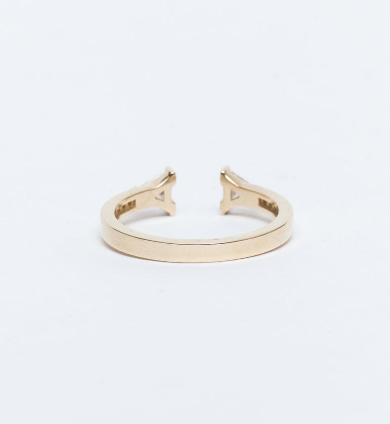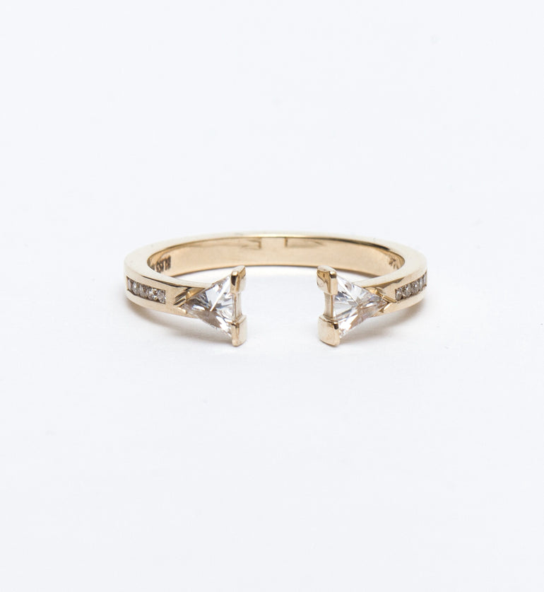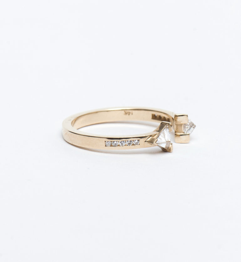 A pair of matched trilliant-cut white diamonds give the open form of this gold ring a powerful, architectural feeling. Channel-set diamonds along the band emphasize its linear design while adding an extra sparkle. Pair this style with the Illuminate Ring for a dynamic mix of angles and curves that breaks the mold of what bridal jewelry can look like. Made in the U.S.A.