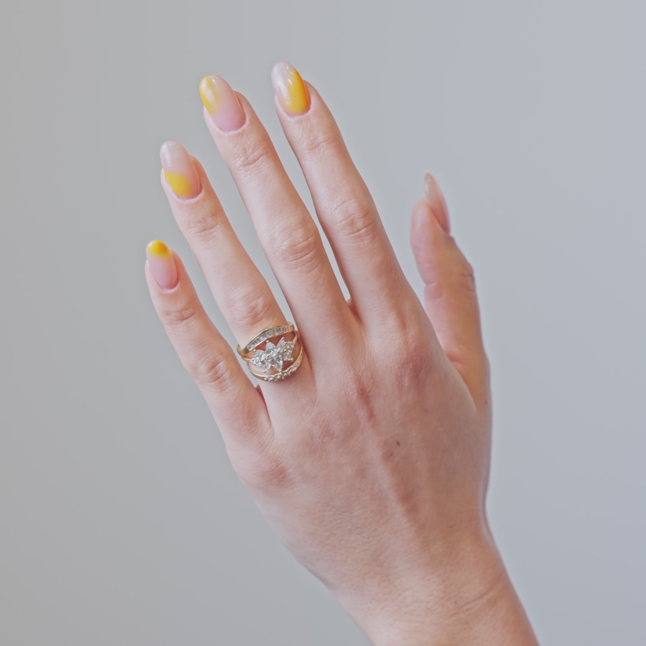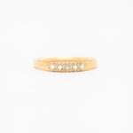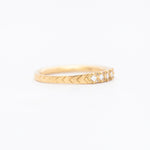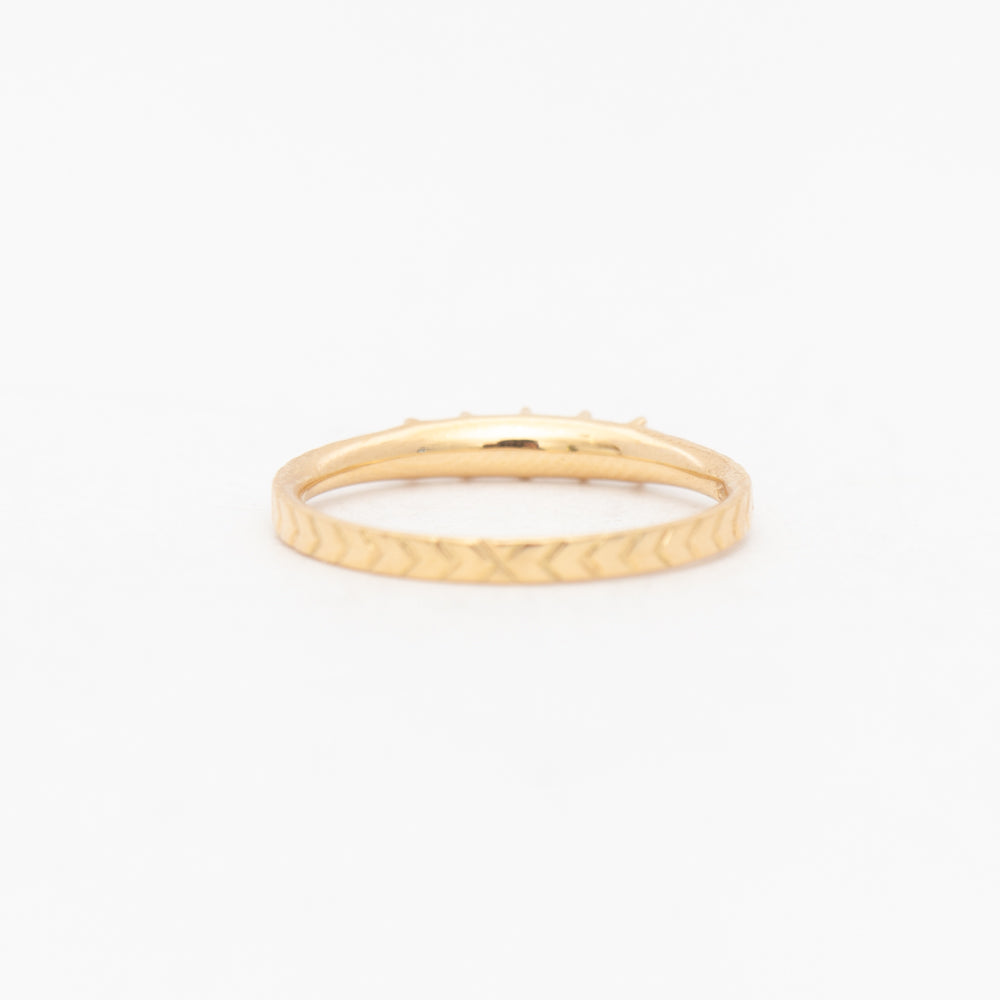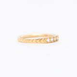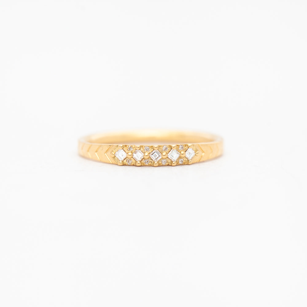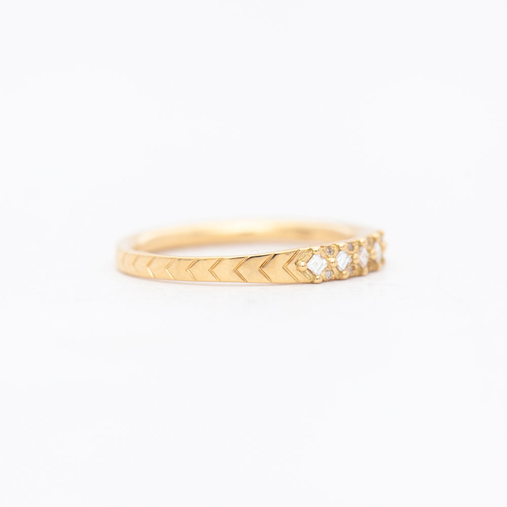 Whether on a canvas of gold, diamonds, or both, the geometric genius of Tel Aviv-based Artemer never fails to shine. In this beautifully textured and tapered band, an engraved chevron pattern flows around the curve of the ring, centered by a row of carré-cut diamonds set on their axes. A dusting of tiny white diamonds adds a finishing touch of glamour. Perfect when worn alone, or as a textural addition to any ring stack. Made in Israel.