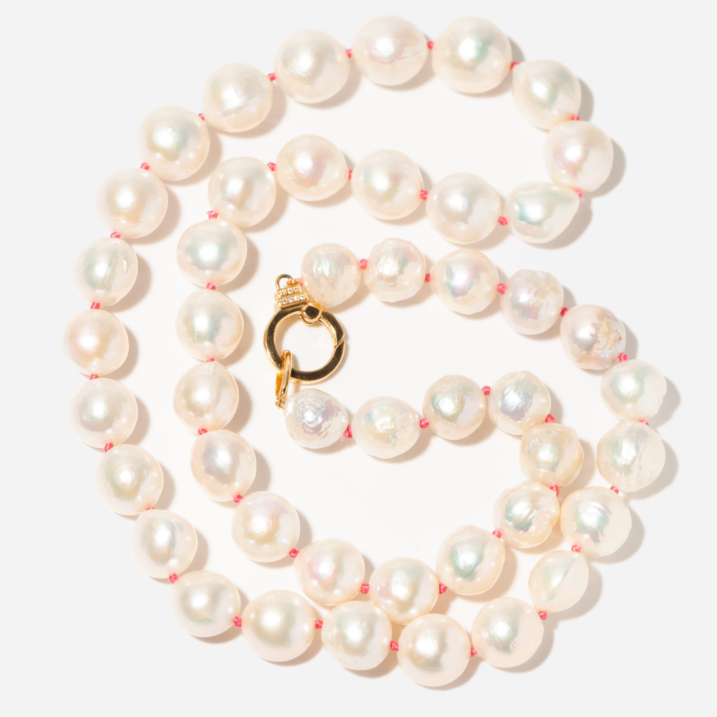 18k yellow gold beaded necklace with cultured baroque pearls and white pavé diamonds (G color, HSI clarity) totaling 0.09 carat. Tied with pink silk thread.