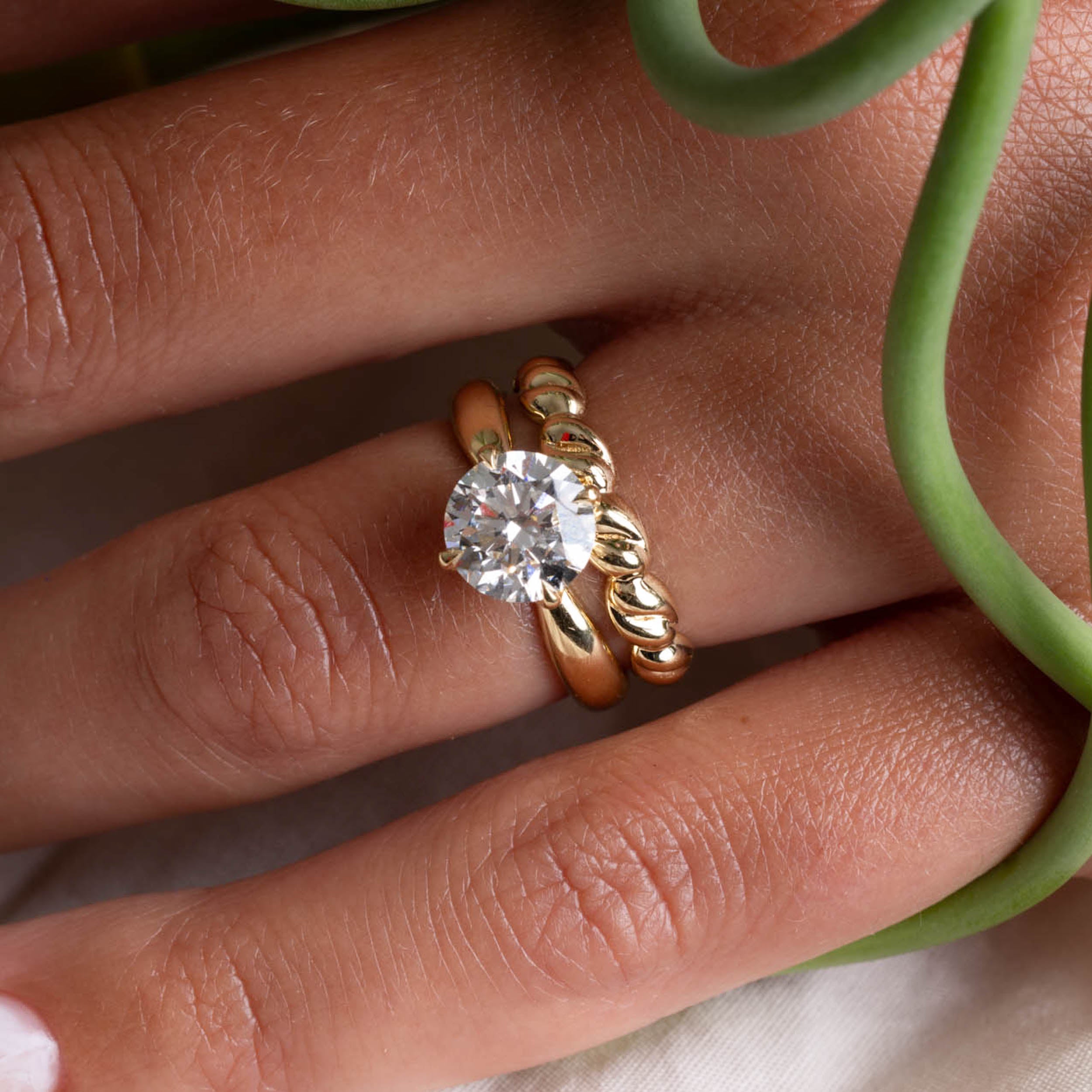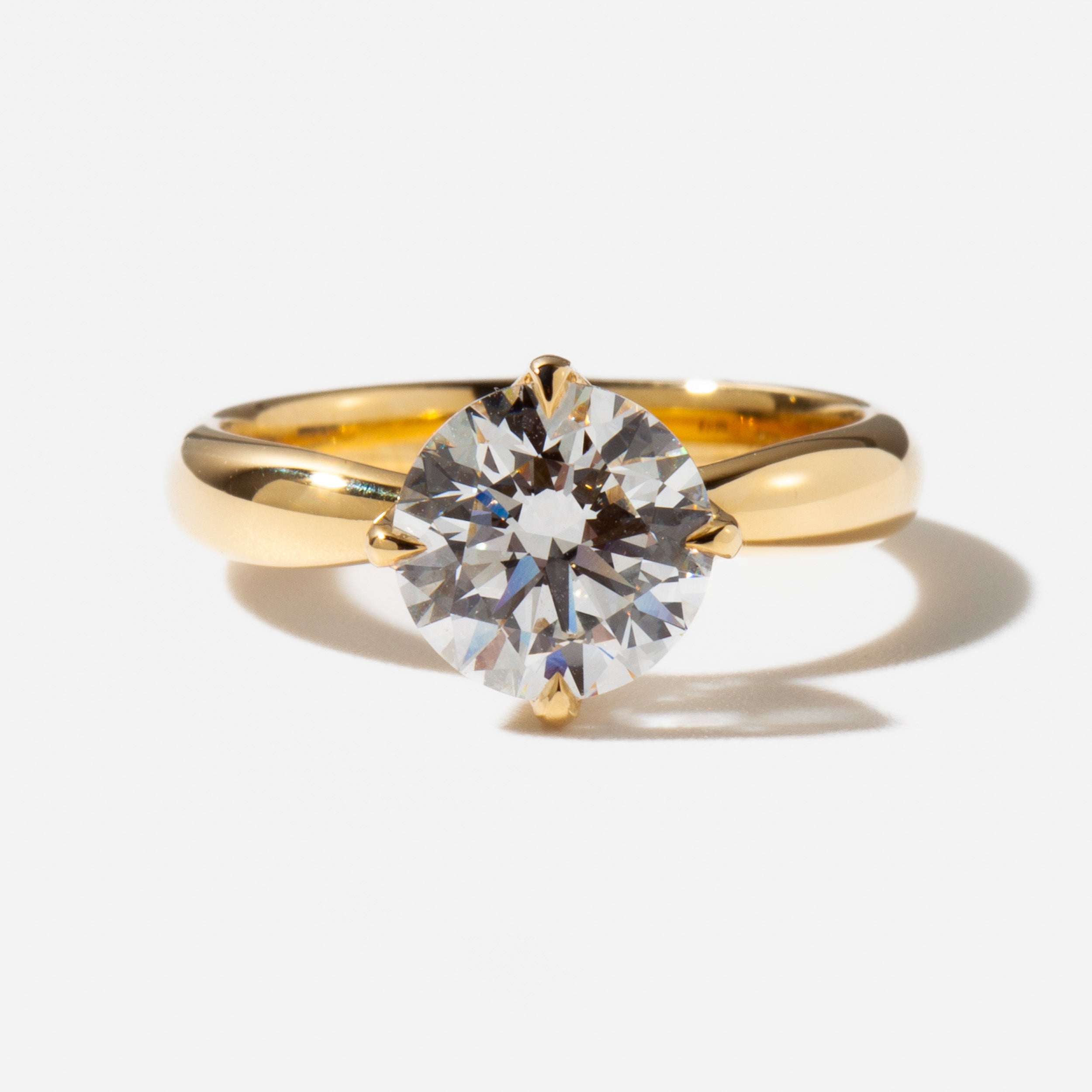 Crafted in 18k yellow gold with four 1 mm round brilliant diamonds and approximately 2.0 carat IGI certified Round Diamond or alternative gemstone.