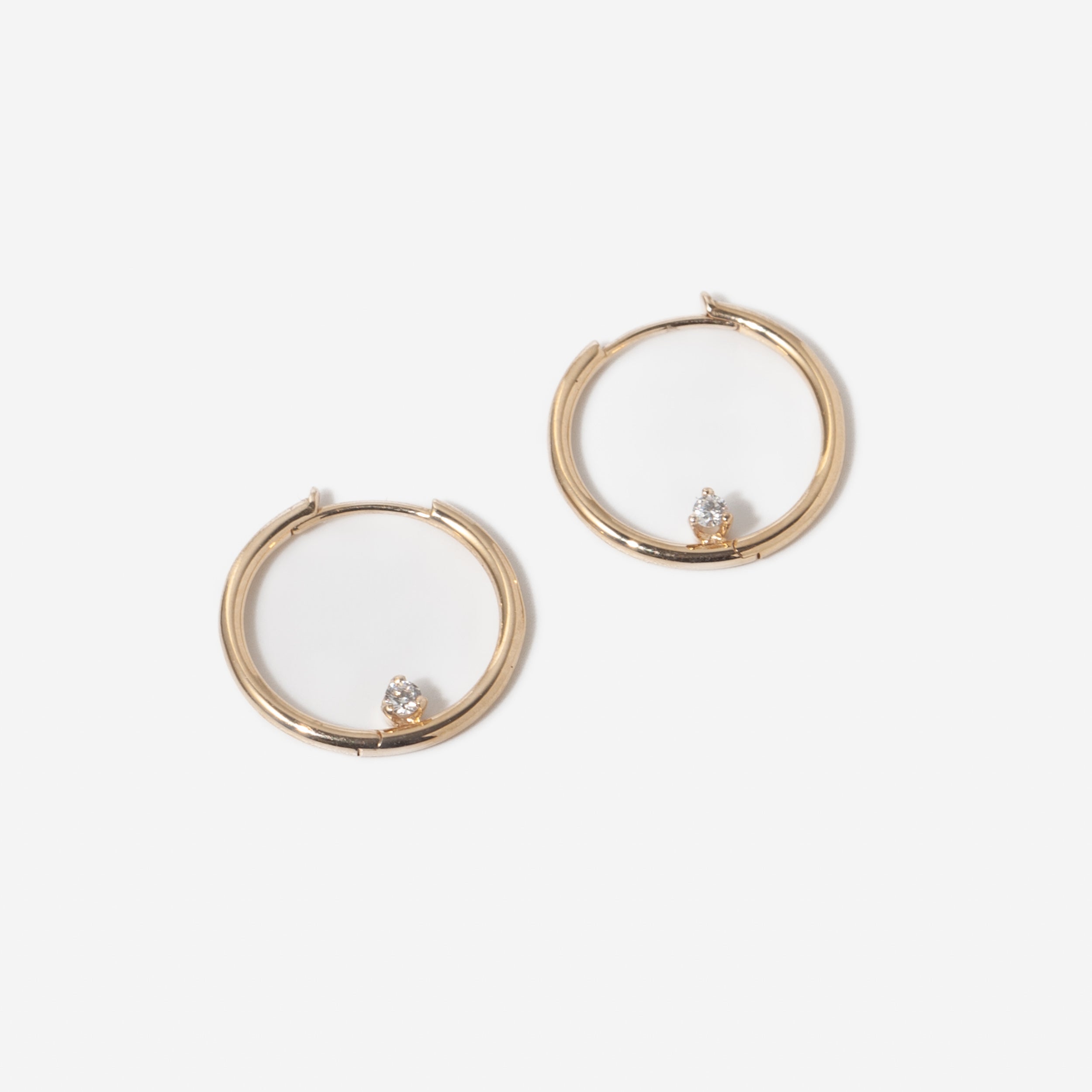 These prong diamond huggie hoops and a playful version of a classic hoop. With the diamonds facing outward, these earrings will sparkle with you all day and night. Designed in Los Angeles, California.