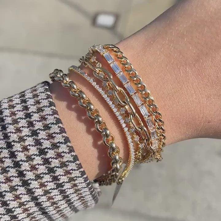 Double the gold, double the luxury! This new bracelet by Los Angeles-based Adina Reyter features a buttery smooth and bold rolo link chain that hugs the wrist in a luscious, golden embrace. Wear it alone to elevate any look day or night, or stack it with your favorite bracelets for a stunning play of metals and textures. Finished with an extra large spring-ring clasp. Designed in Los Angeles.