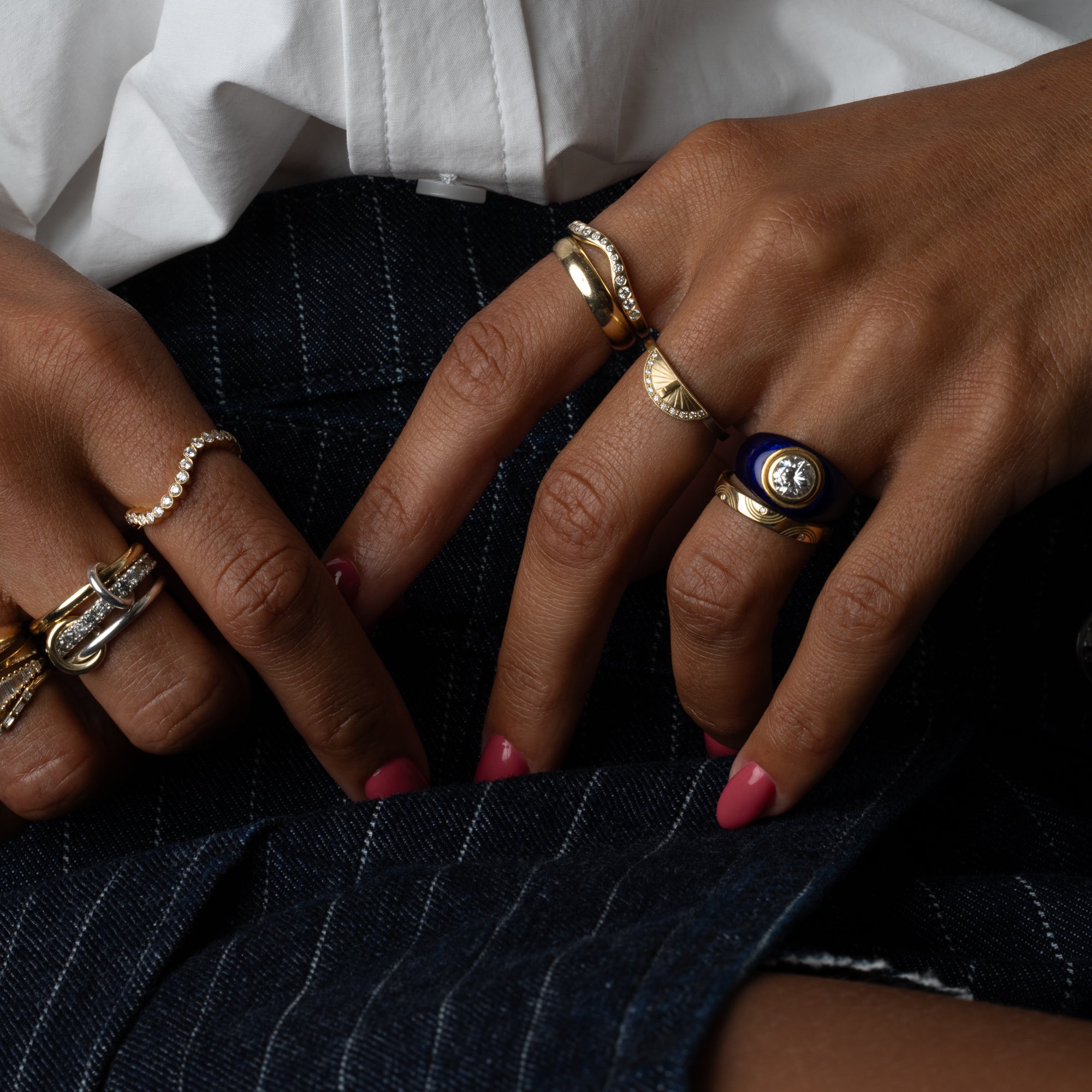 One of the earliest timekeeping methods known to humankind, the sundial was a pivotal scientific discovery—a stunning combination of geometry, nature, and light. This delicately detailed ring by designer Melissa Scoppa pays homage to this time-worn symbol, set with a curve of sparkling diamonds, hand-applied milgrain, and meticulously carved rays that fittingly catch the light of the sun. Its flat edge makes it a perfect ring to stack against eternity bands or simple gold stackers. Made in the U.S.A.