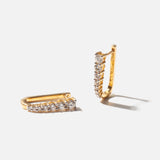 New to our collection, these half paperclip huggie hoops are a must-have for any ear stack. The shiny yellow gold paperclip shape is adorned with prong-set graduating white diamonds, facing outward for maximum sparkle. Perfect for adding some shine to your daily ear stack! Sold as a pair.