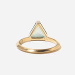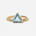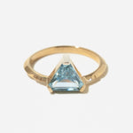 A luminous trillion-cut blue sapphire takes center stage in this striking solitaire, its glacial, sky-blue color radiating clarity and depth from every angle. Three delicate gold prongs lift the stone just above the band, allowing light to pour freely through each facet. A subtle engraved detail along the warm yellow gold band adds a quiet layer of craftsmanship, making this ring as thoughtfully designed as it is breathtaking to wear.