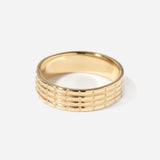 The architectural form of shoji doors directly informs the hand-carved pattern on this unisex band. Washi paper and wood are transformed into solid gold, each rectangle carved one at a time for a perfectly imperfect finish that will weather with age and wear. Forever changing and forever the same; a perfect way to say "I do". Made in the U.S.A.